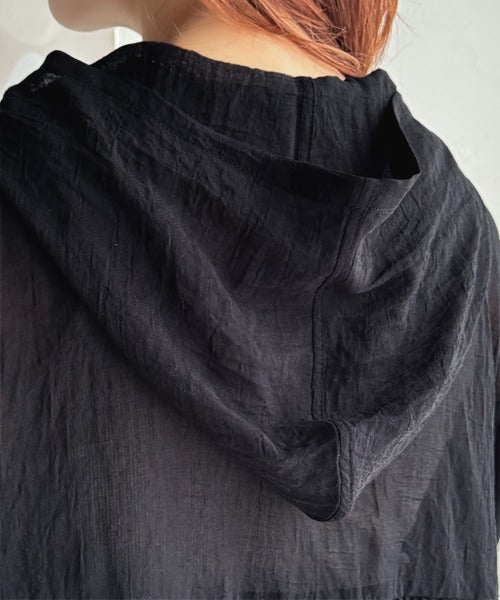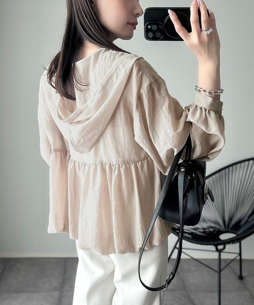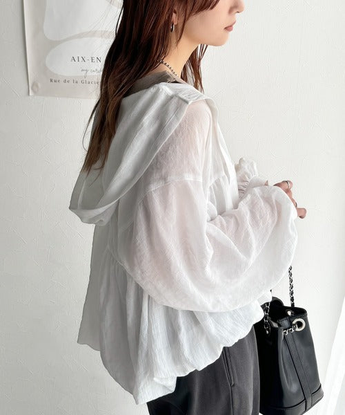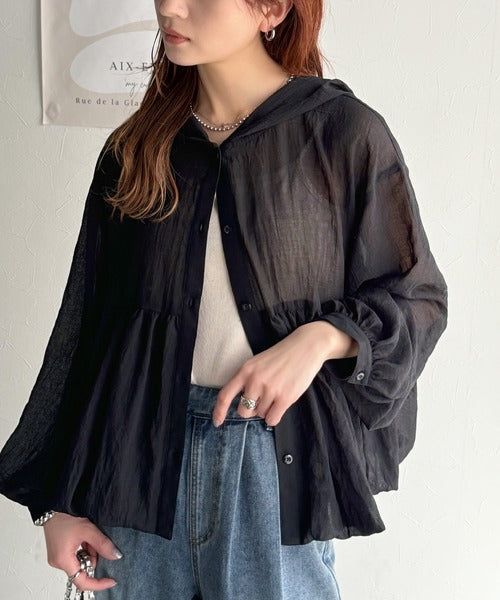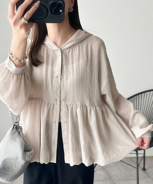 エアリーなシアー素材が魅力のフード付きブラウス。