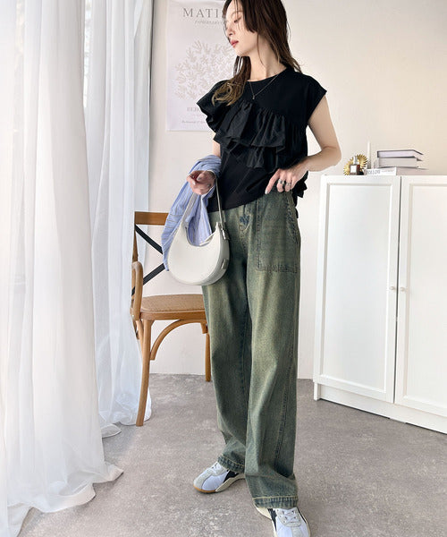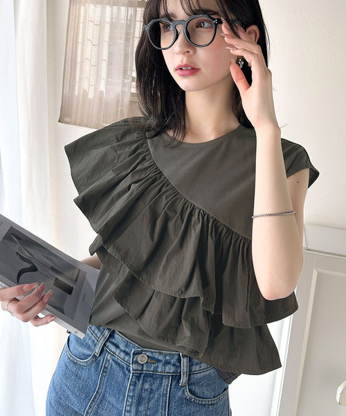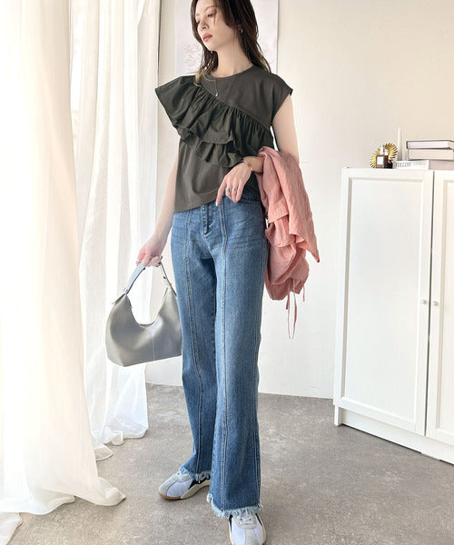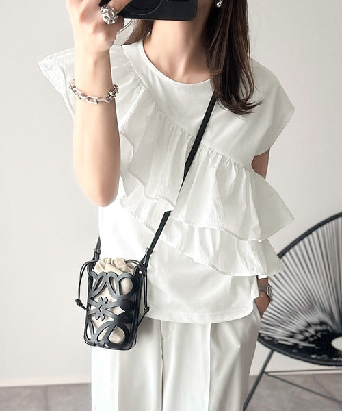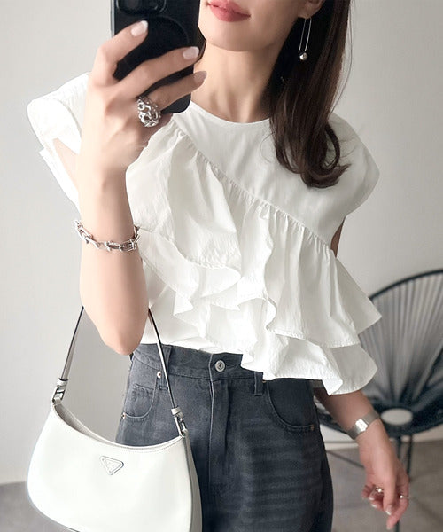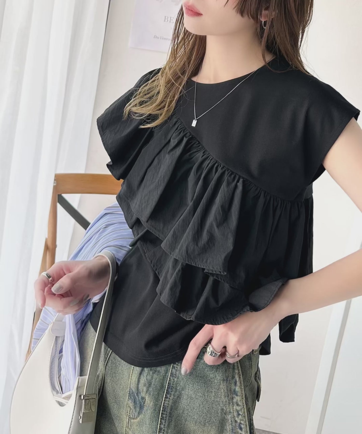 シンプルに着こなせるのに、存在感抜群なラッフルトップス。