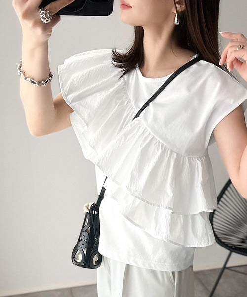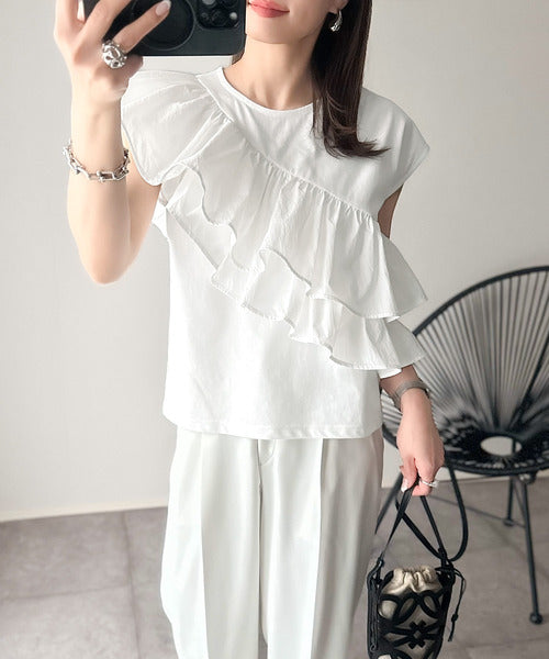 一枚で着映える♪異素材ドッキングアシメトリーラッフルデザインフレンチスリーブカットソー ce1020216