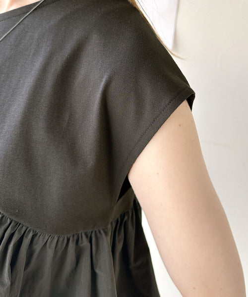 肌ざわりの良いカットソー生地に異素材のラッフルが