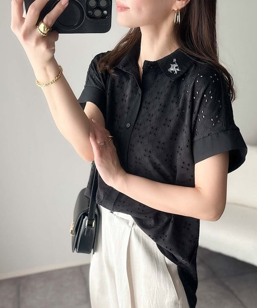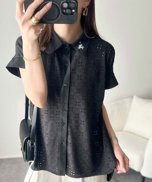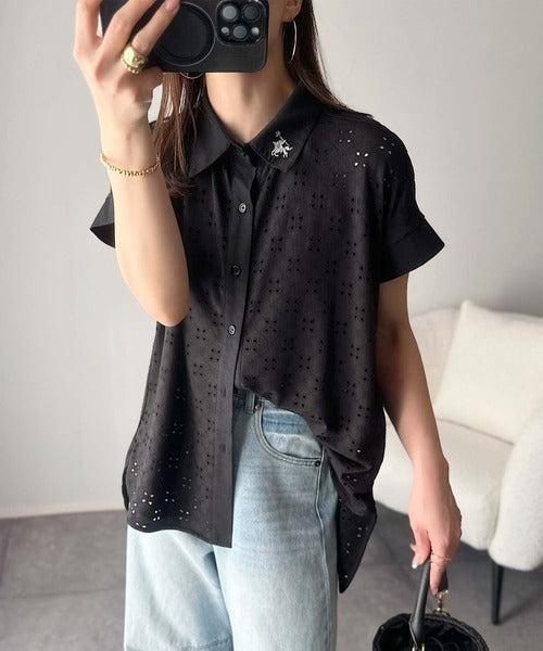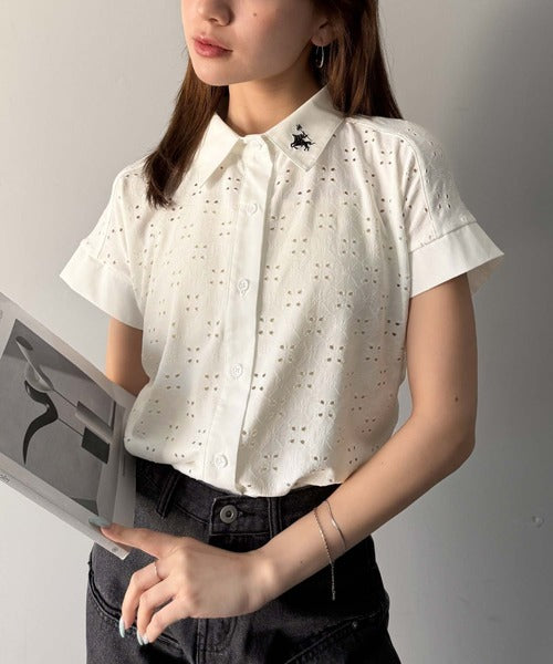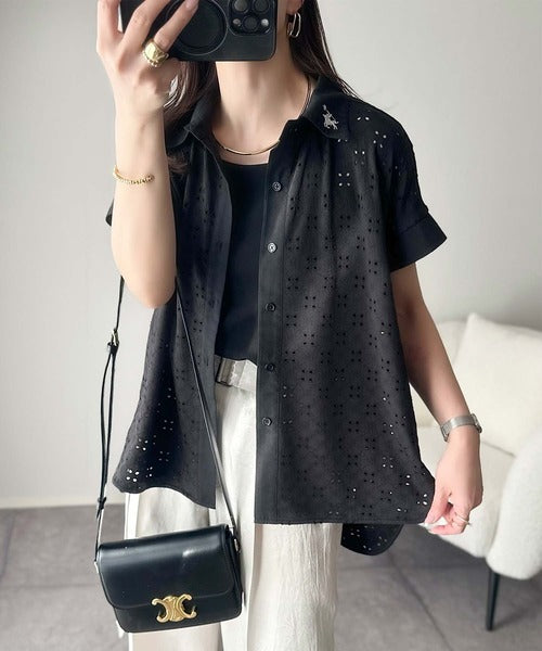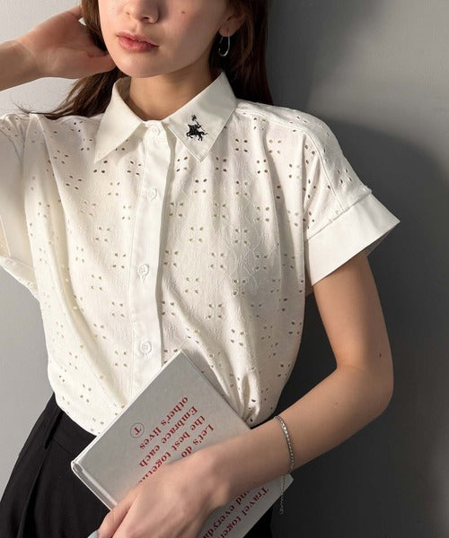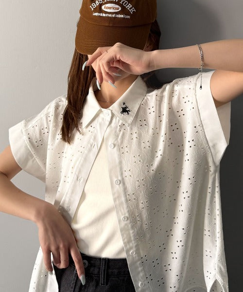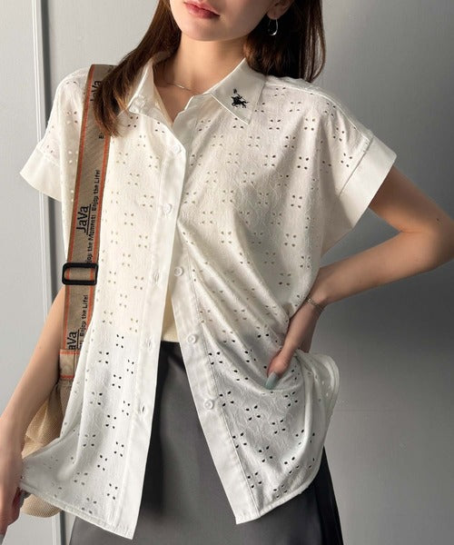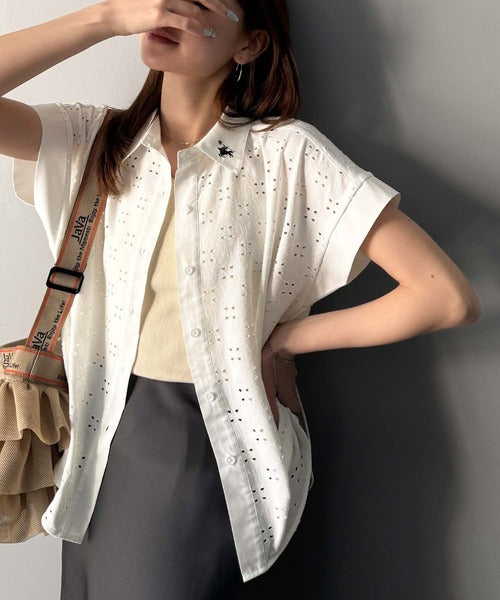 さっと羽織ってきれいめカジュアル。ワンポイント刺繍アイレット柄レースフレンチスリーブシャツ ce1020220