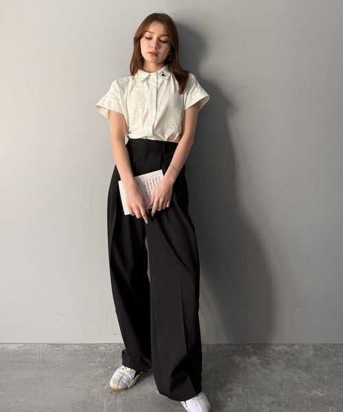 アイレットレースがフェミニンなフレンチスリーブシャツ。
