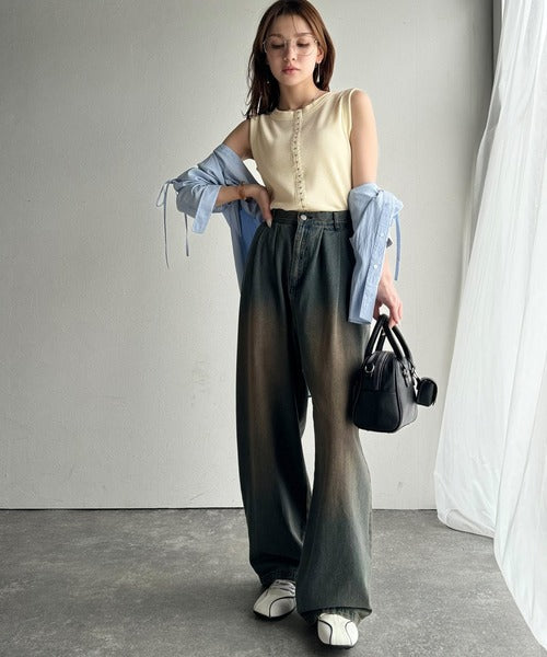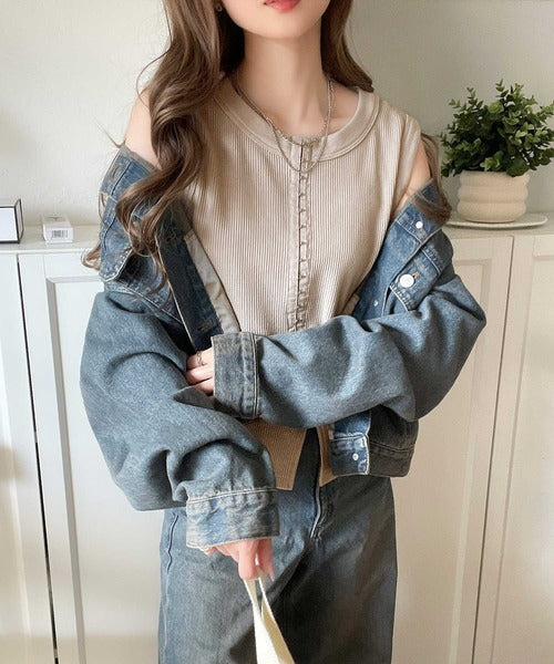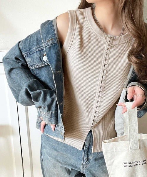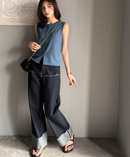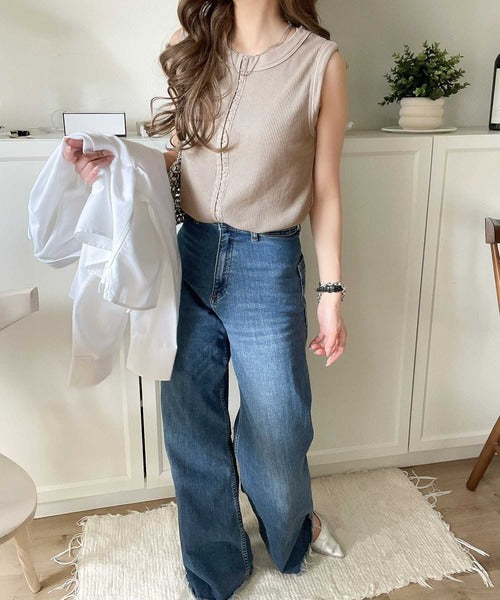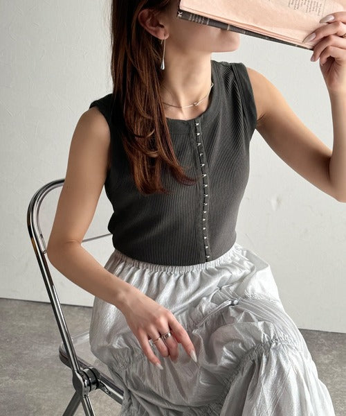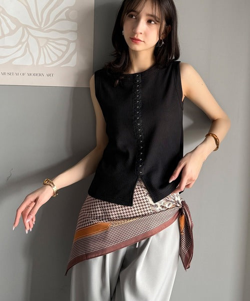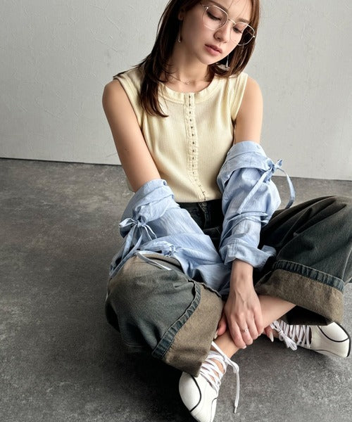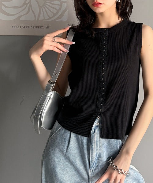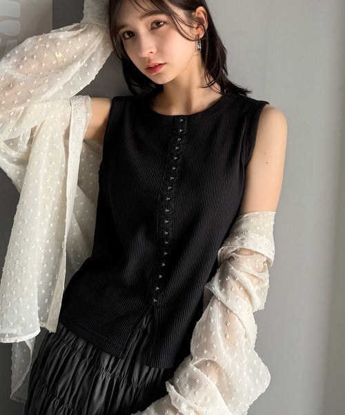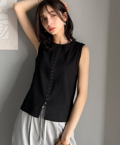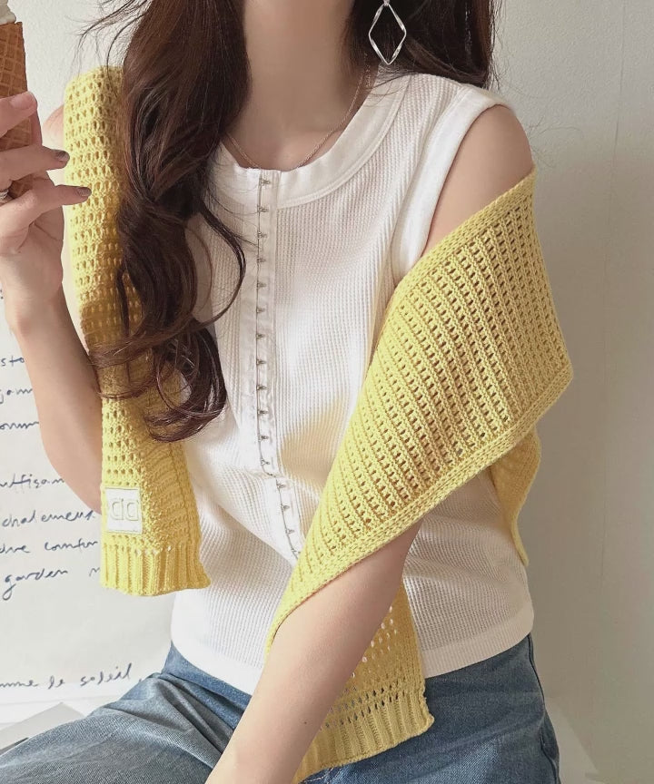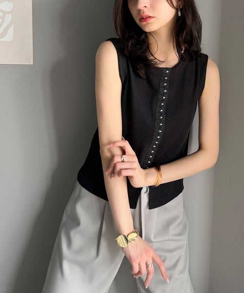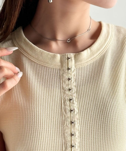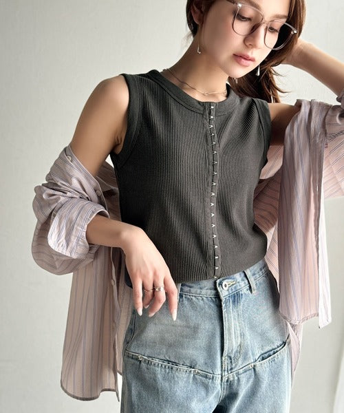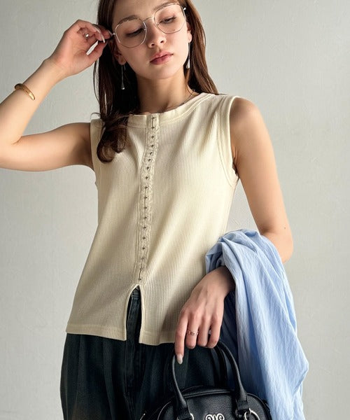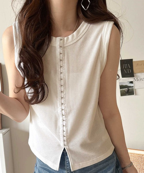 軽やかに魅せる、今どきカジュアルの主役。フロントホックワッフルノースリーブトップス ce1020240