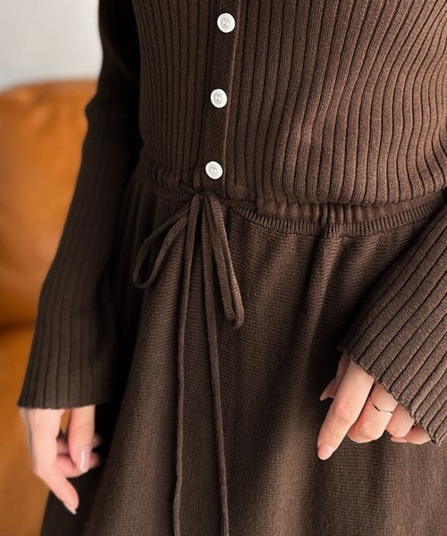 スタイルを引き立てるウエストリボンが特徴のニットワンピース。