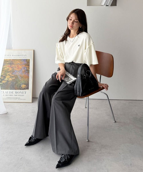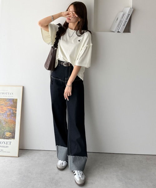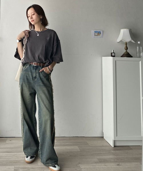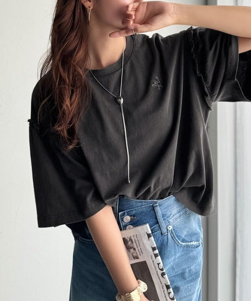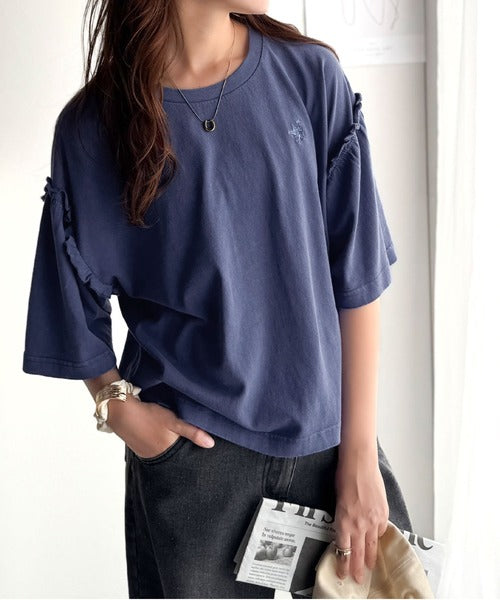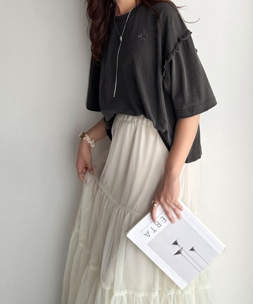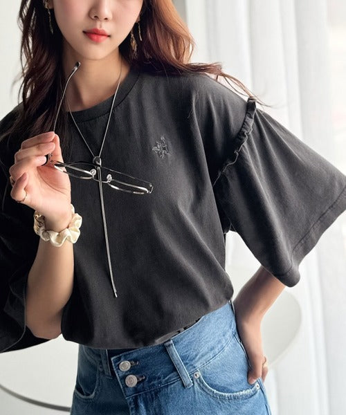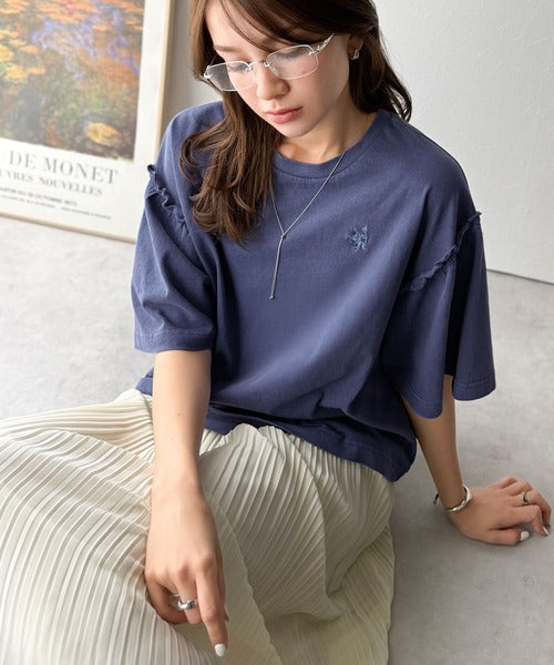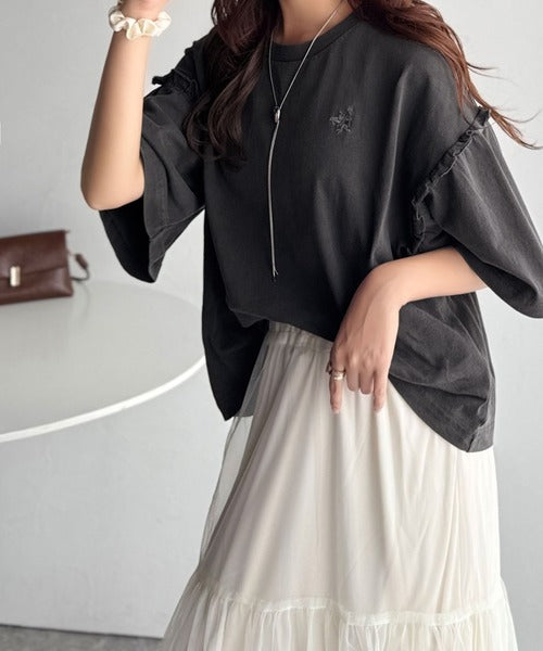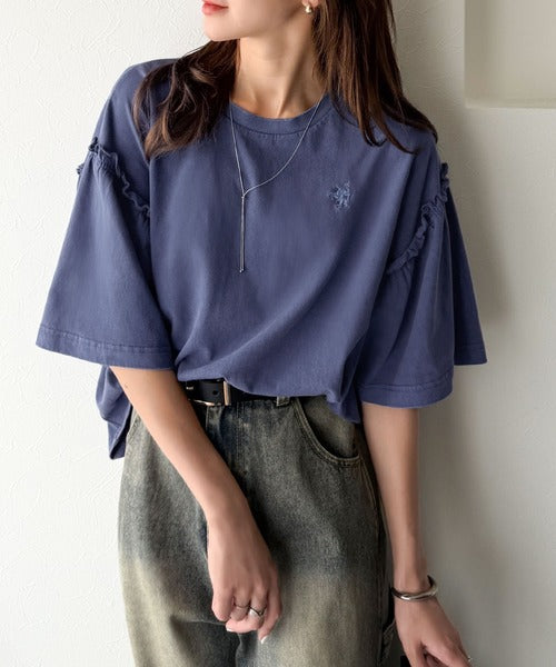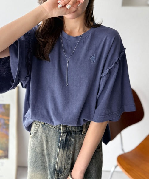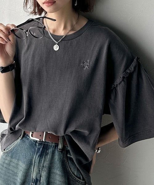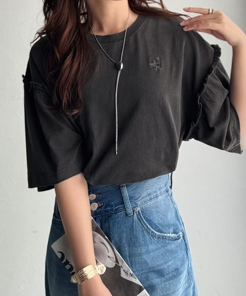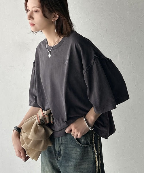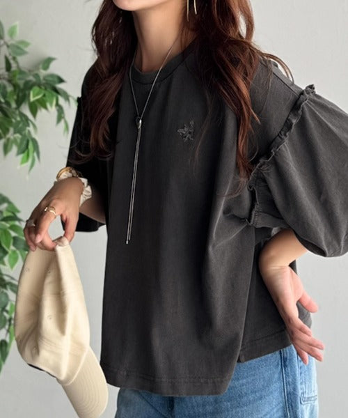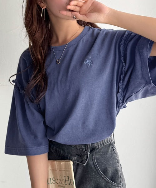 ユーズド感のあるピグメント加工が特徴のTシャツに、袖のフリルでフェミニンな要素をプラス。