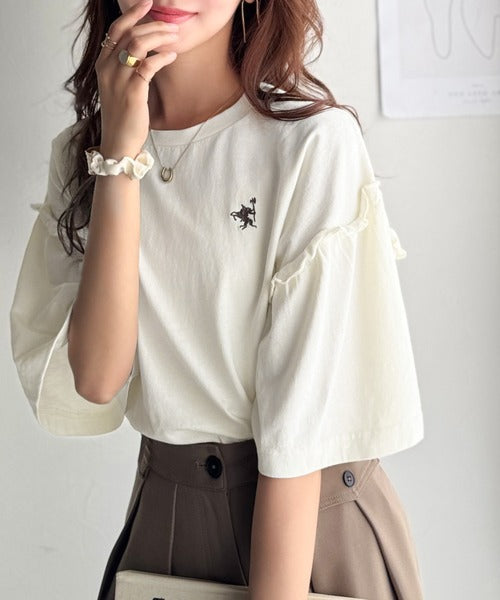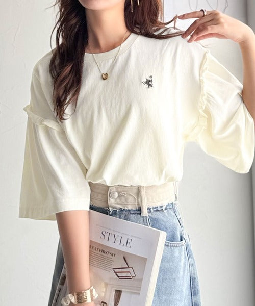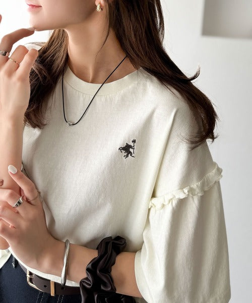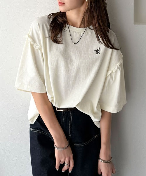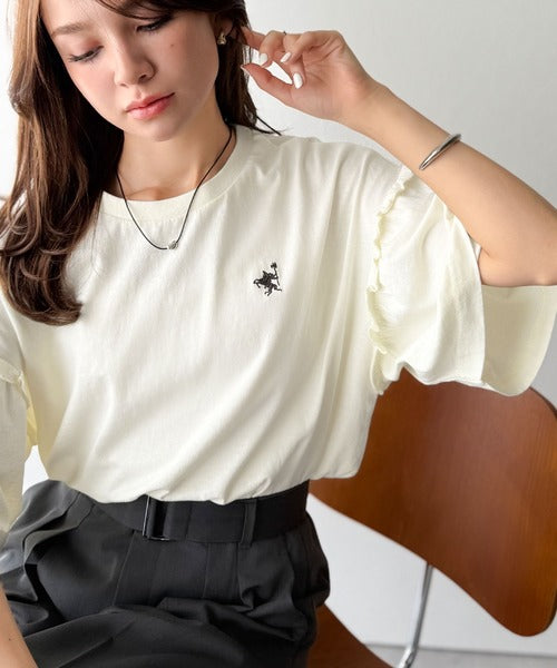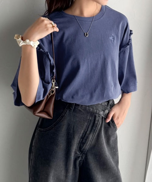 さらり着やすく、ほどよくキュート。なんでもない日にひとさじの甘さを。綿100%胸刺繍ピグメント袖フリルT ce1020330
