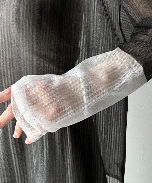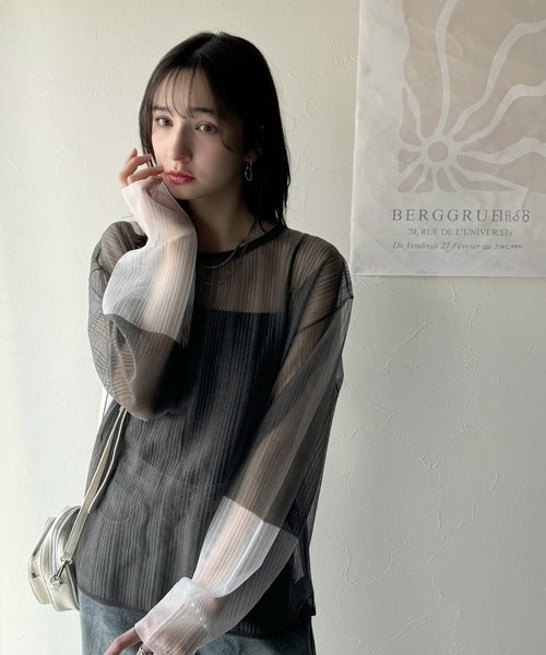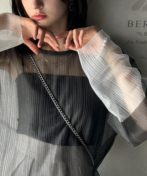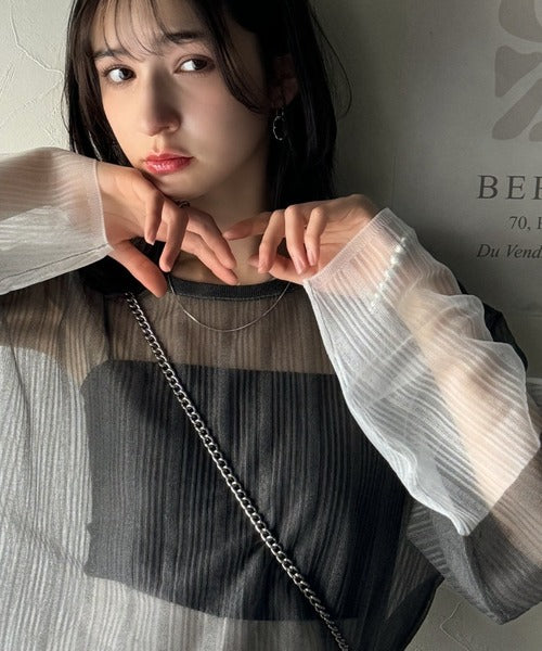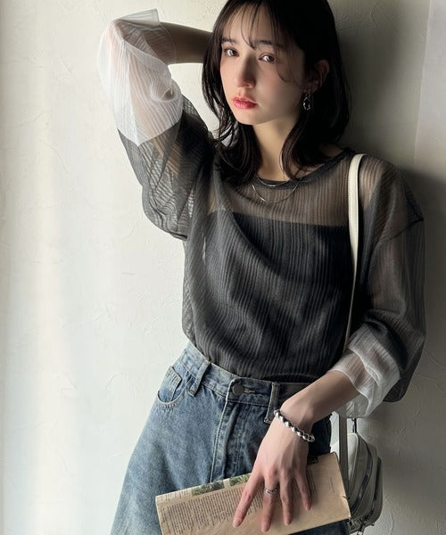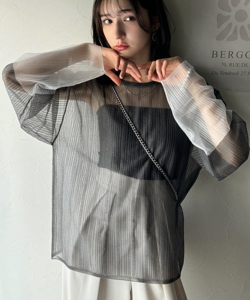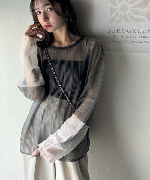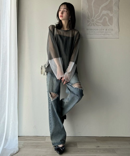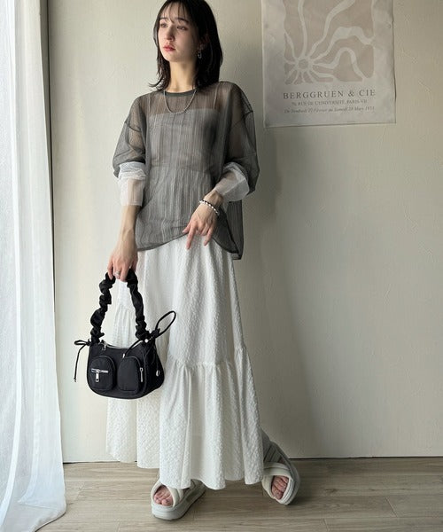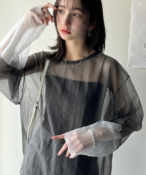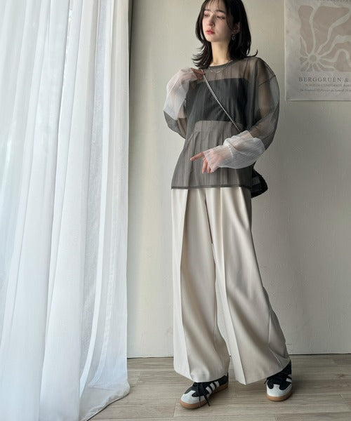 シャリ感のあるシアー素材とワイドなシルエットが特徴的。