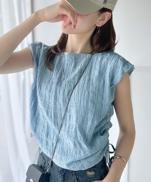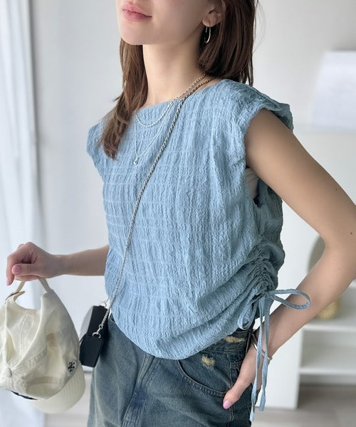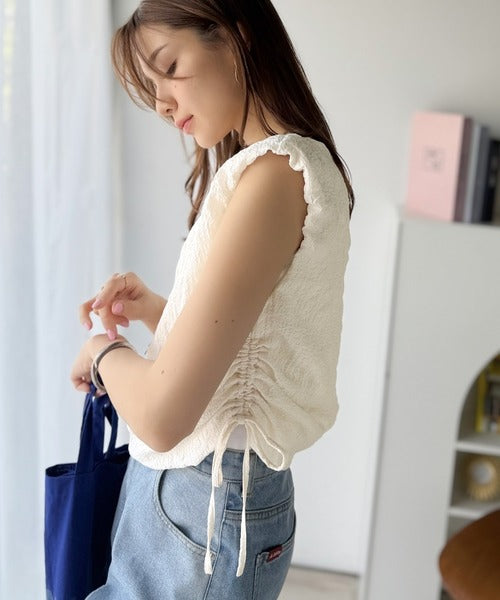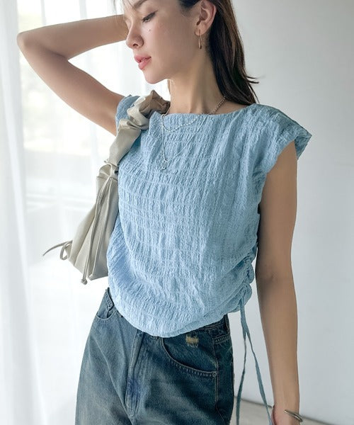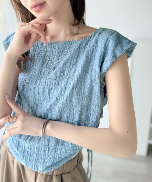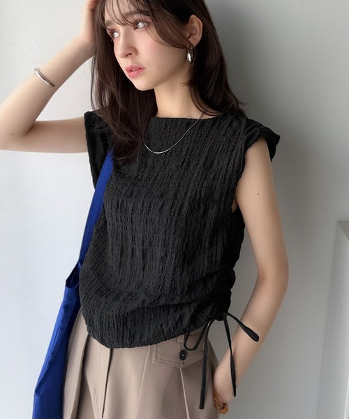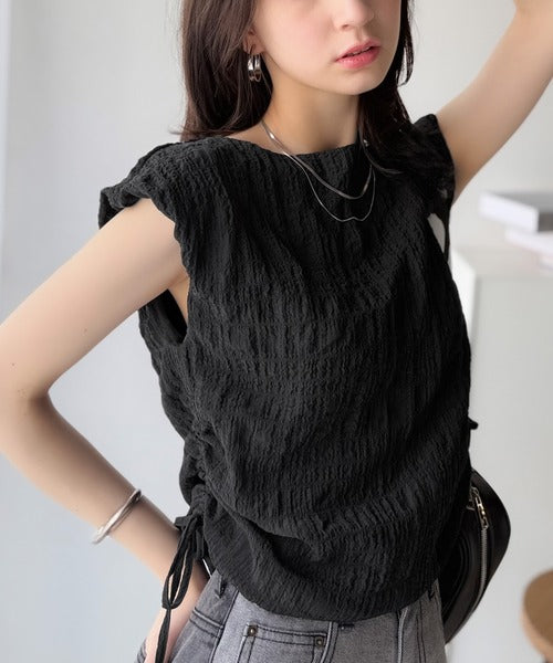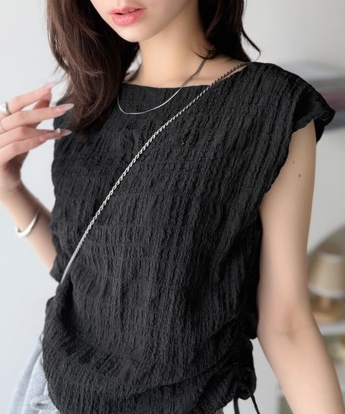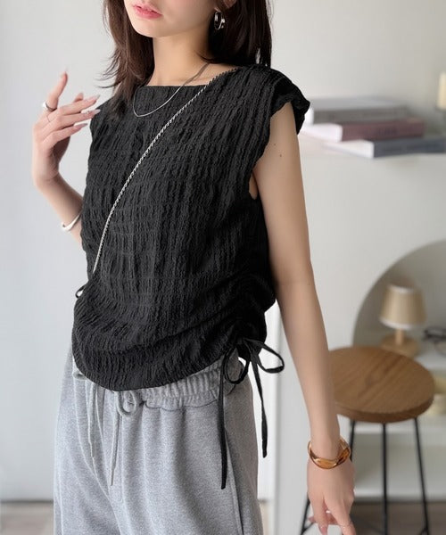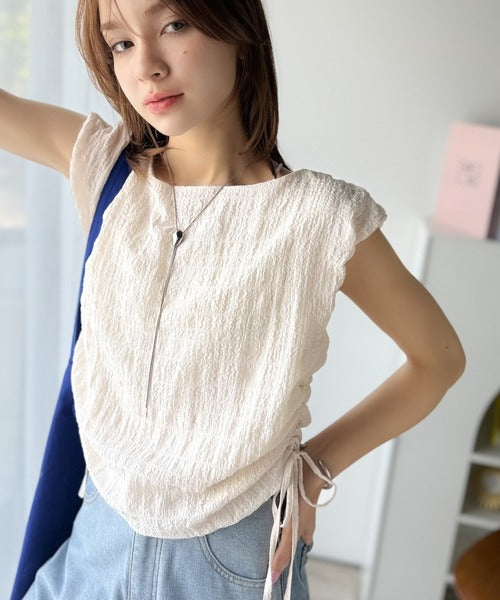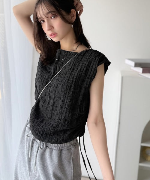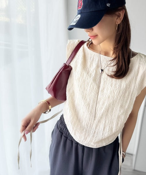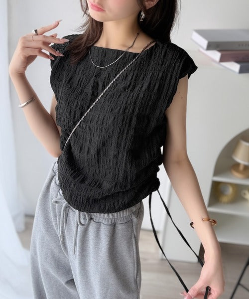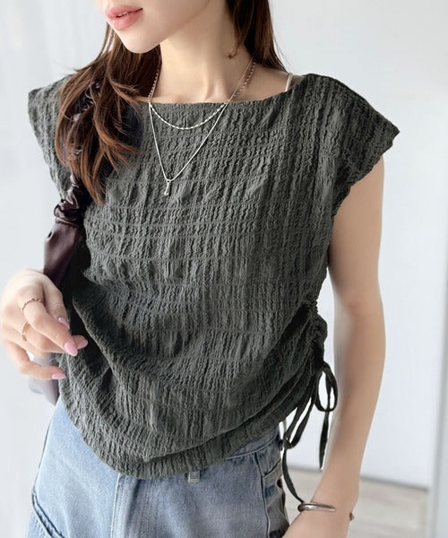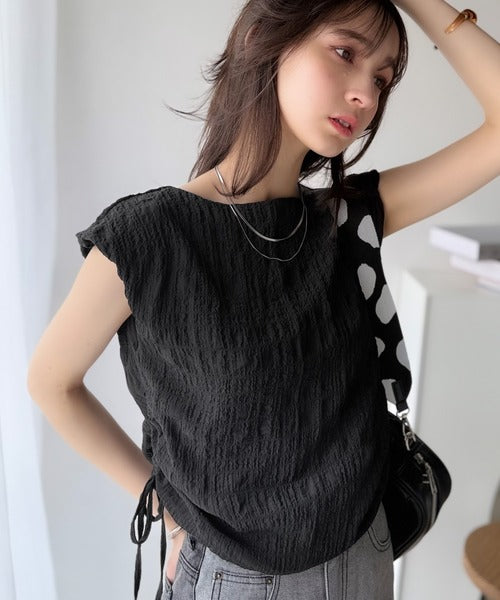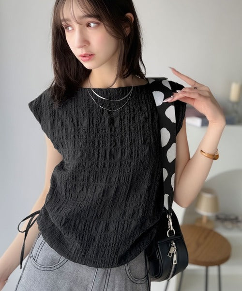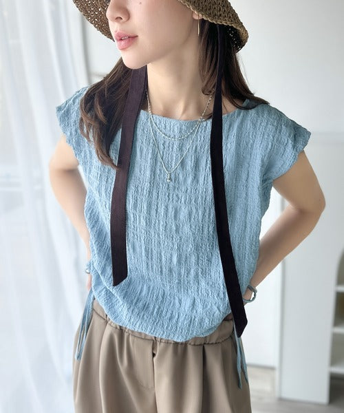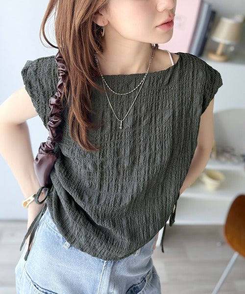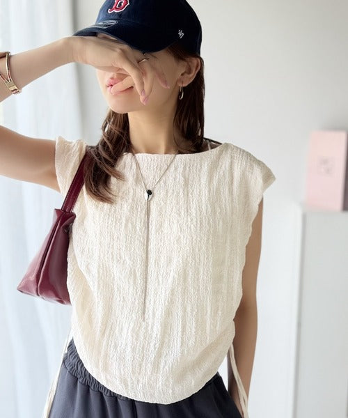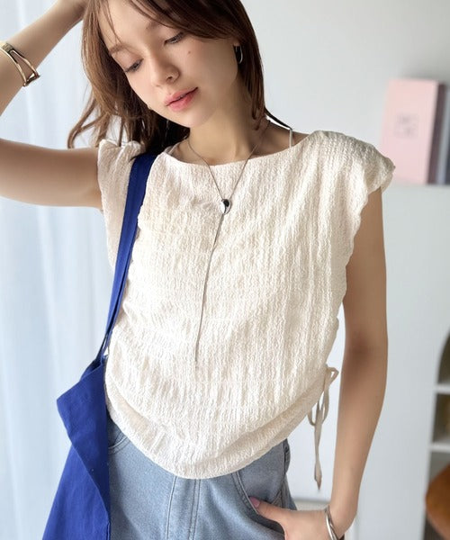 ポコポコ質感が涼しげ、夏の相棒トップス。ボートネックノースリーブサイドドロストリボンポコポコトップス ce1070164