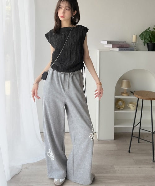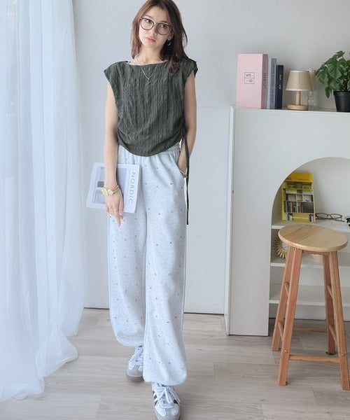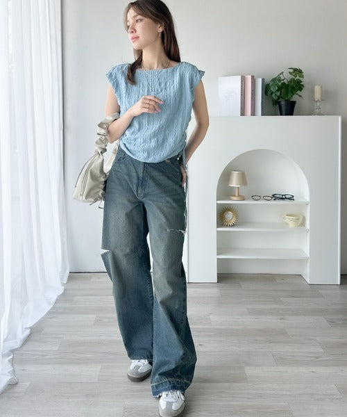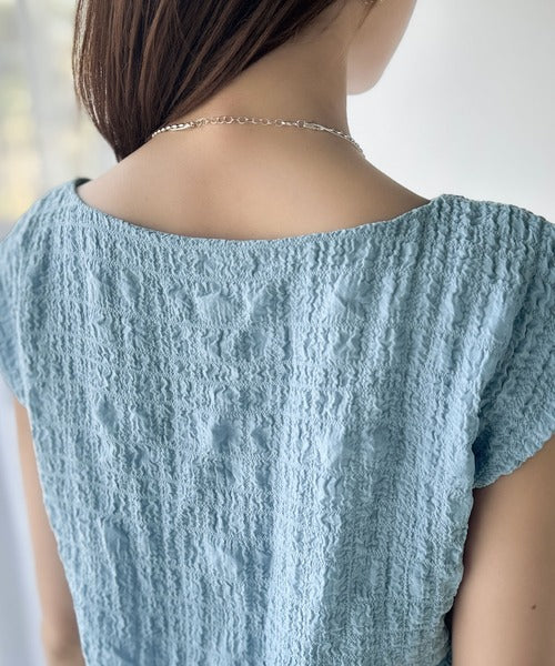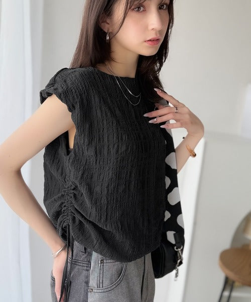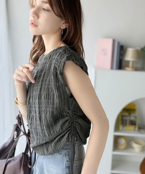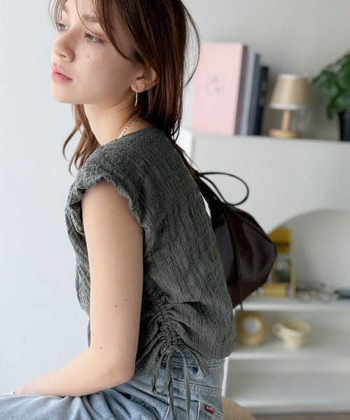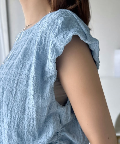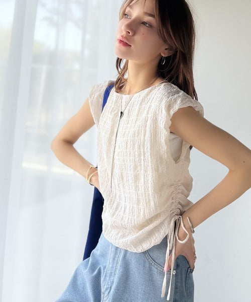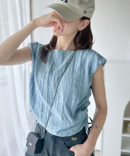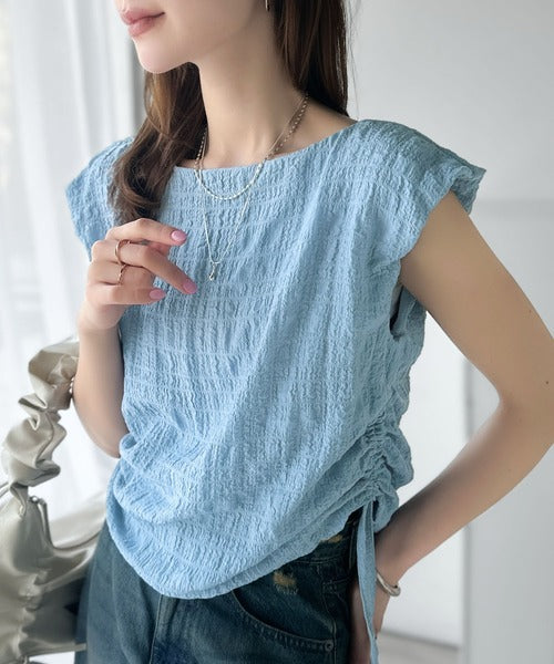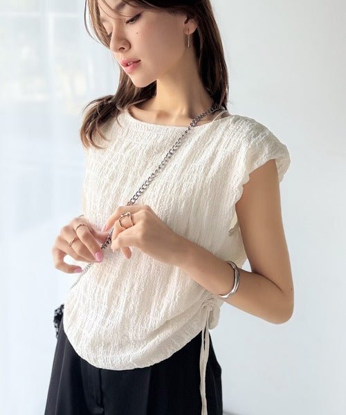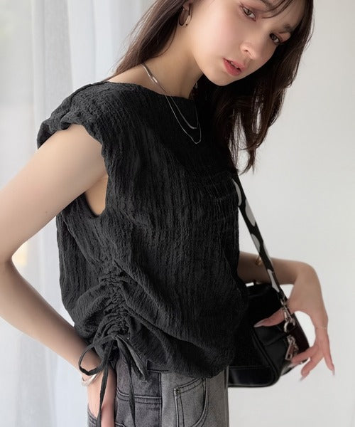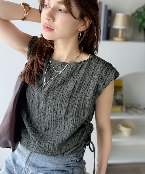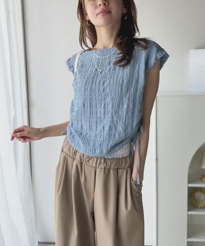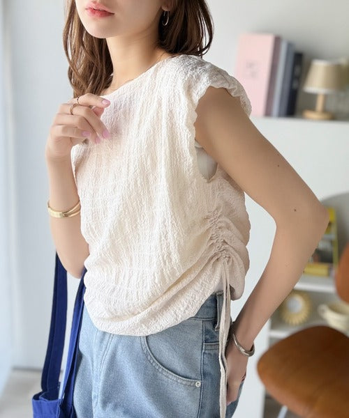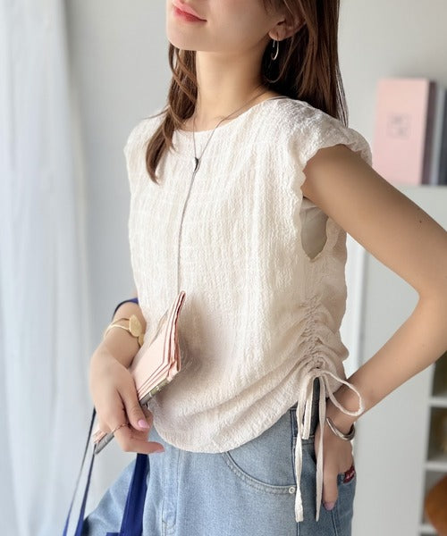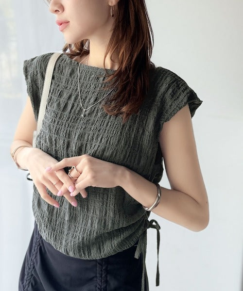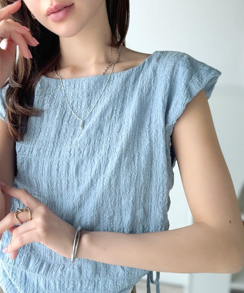 ポコポコ質感が涼しげ、夏の相棒トップス。ボートネックノースリーブサイドドロストリボンポコポコトップス ce1070164