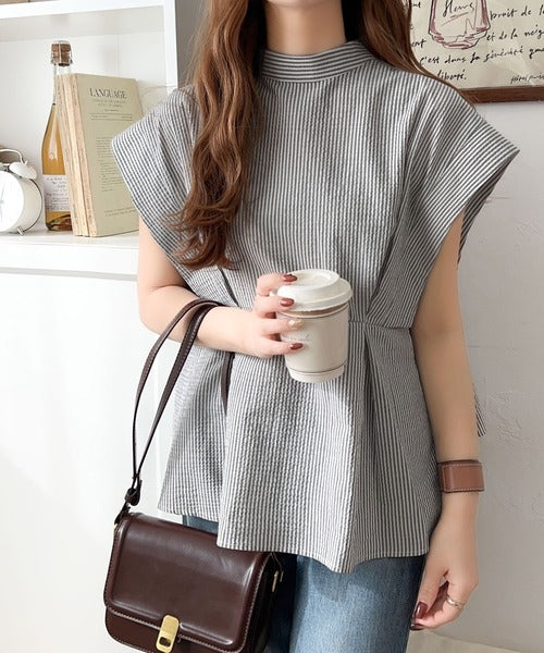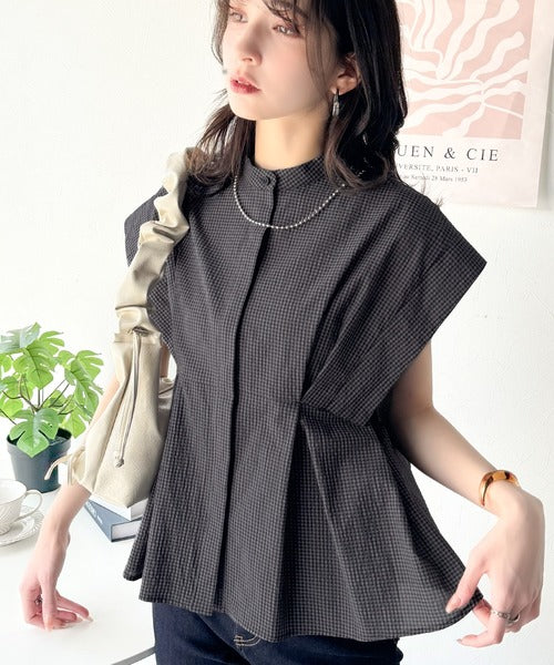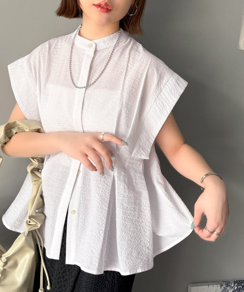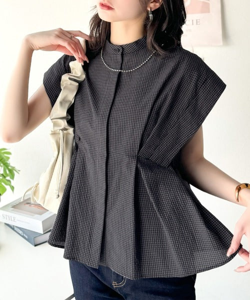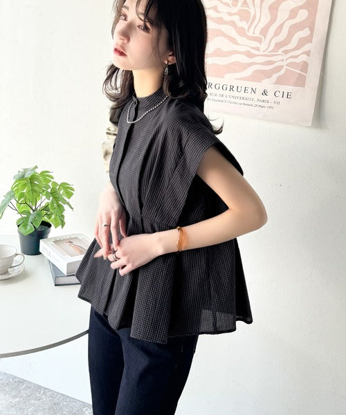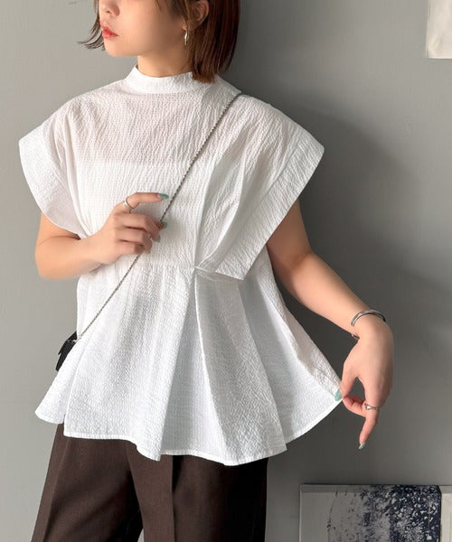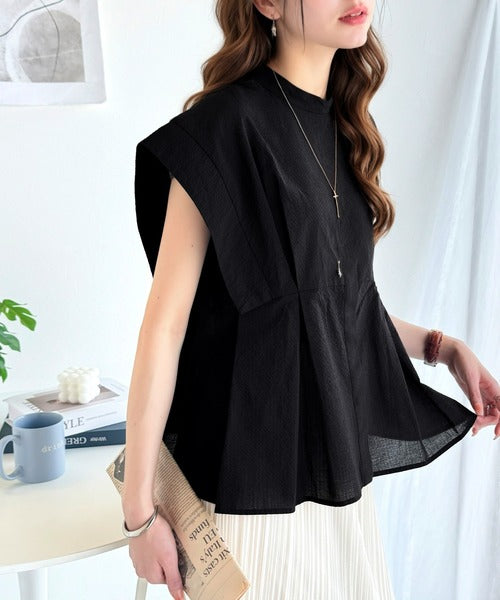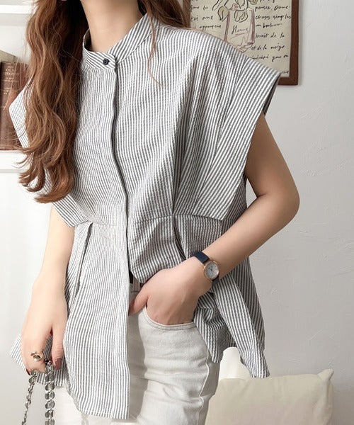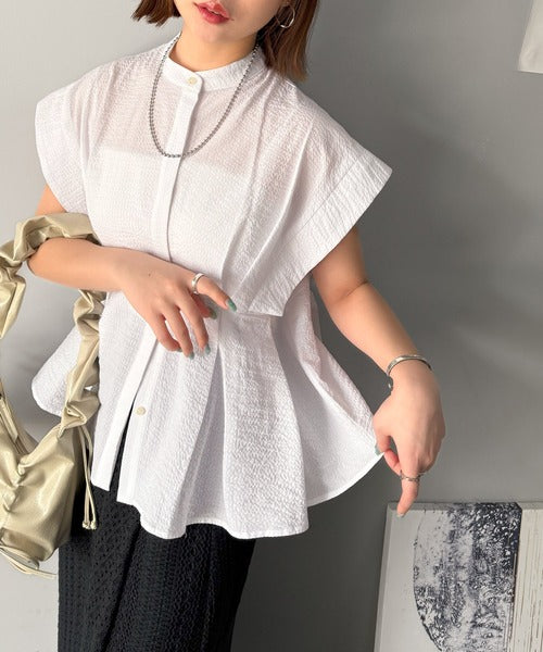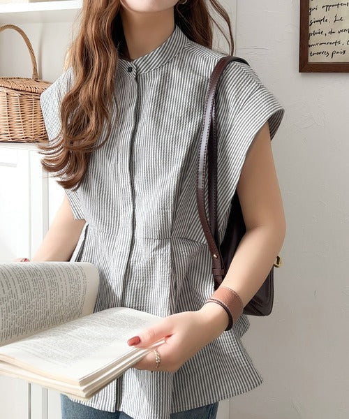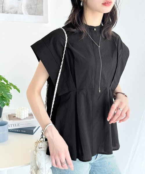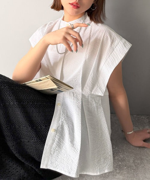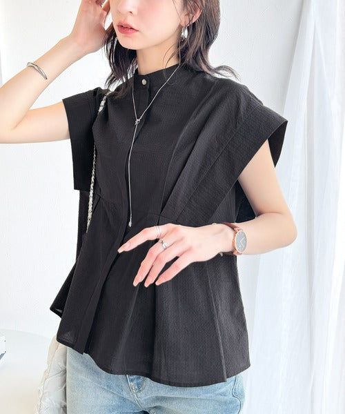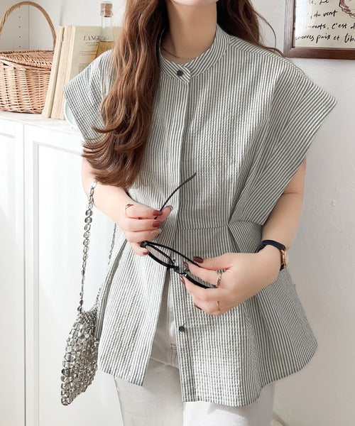上品さとカジュアルのミックス。サッカー素材前後2wayバンドカラーウエストタックブラウス(ノースリーブ) ce1110101