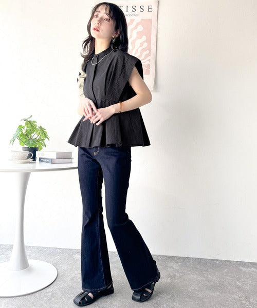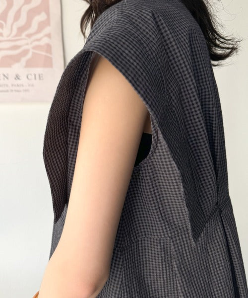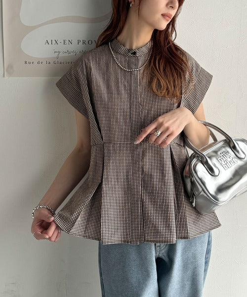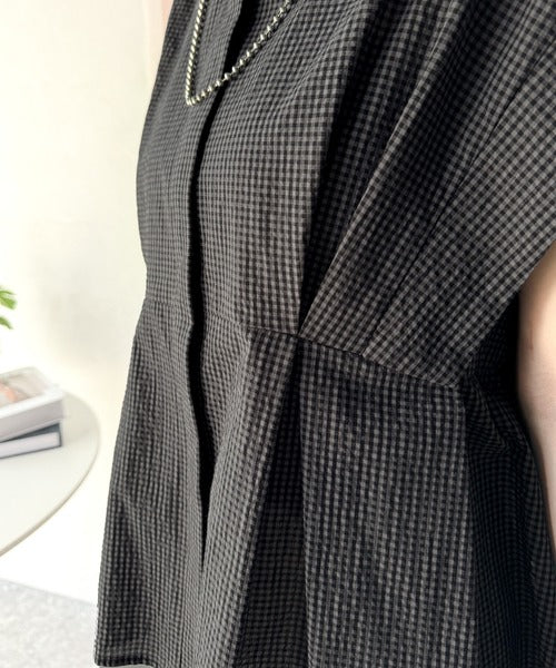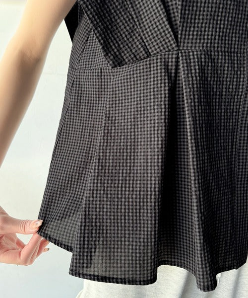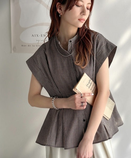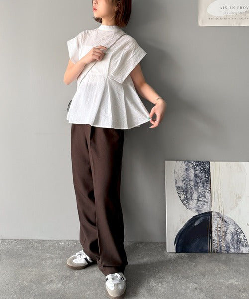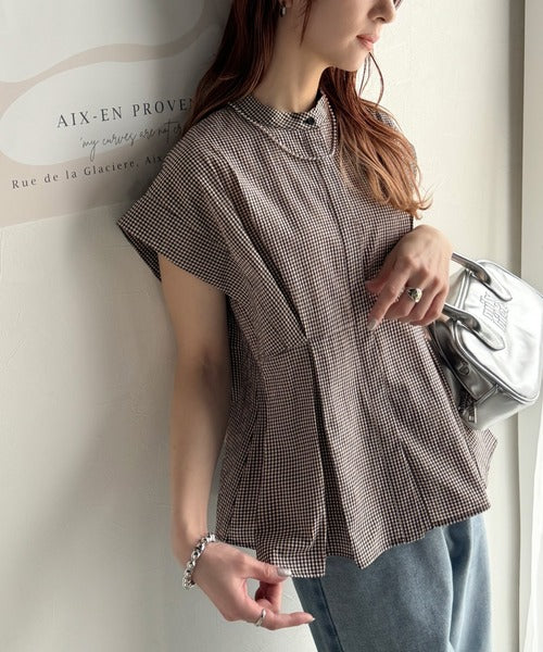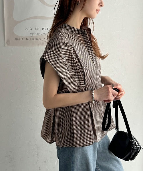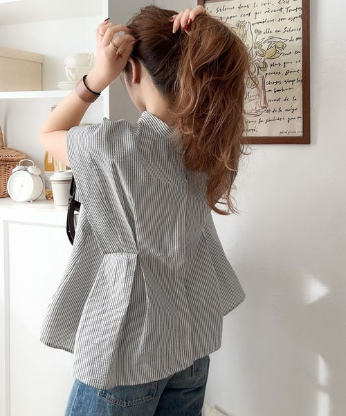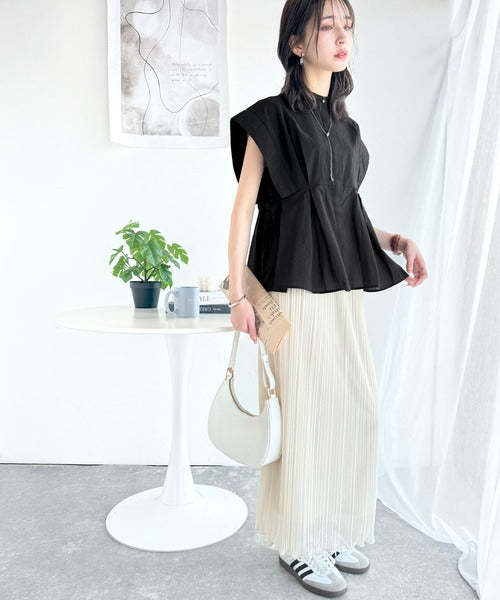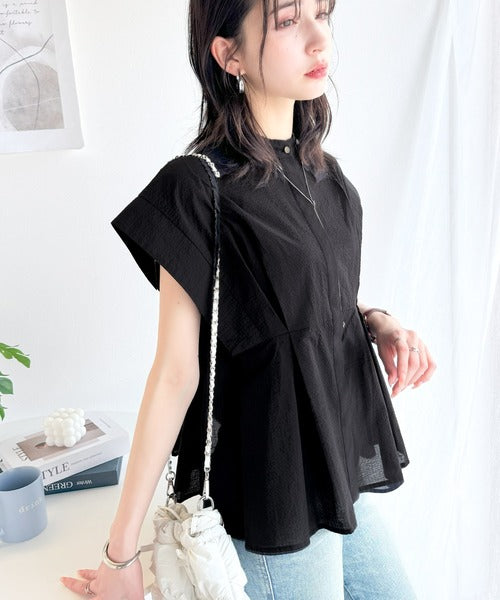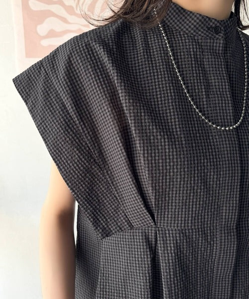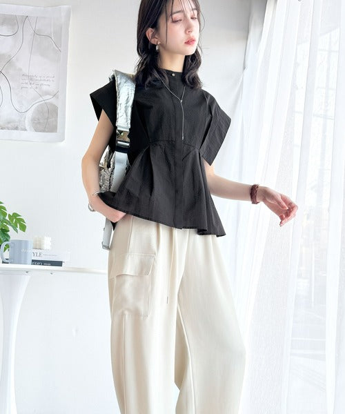 上品さとカジュアルのミックス。サッカー素材前後2wayバンドカラーウエストタックブラウス(ノースリーブ) ce1110101