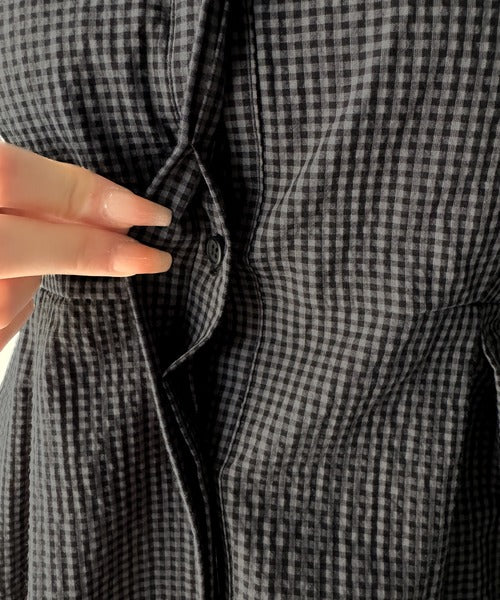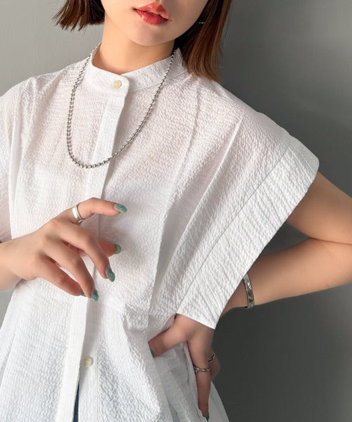 爽やかなサッカー素材で仕立てたバンドカラーブラウス。