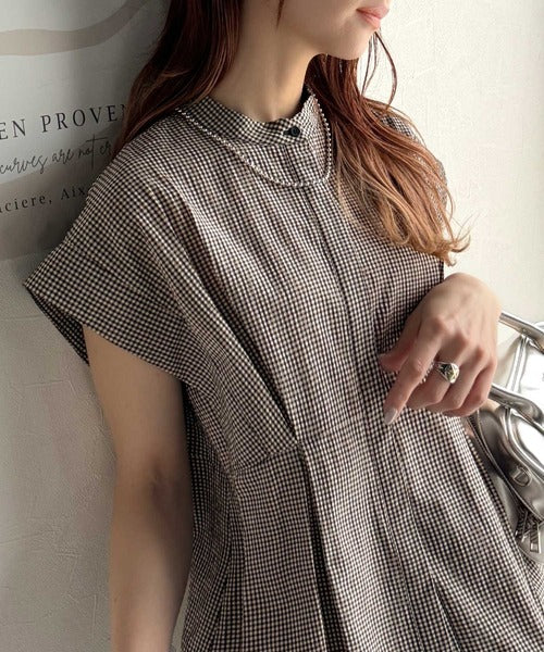 サッカー素材バンドカラーウエストタックブラウスは、上品なデザインとこだわりの素材感が魅力の一枚。