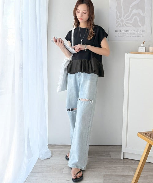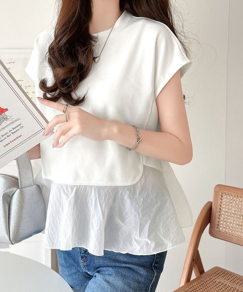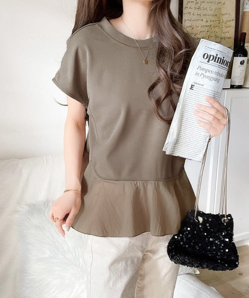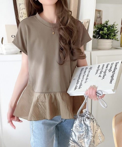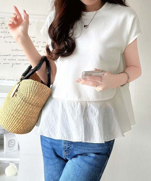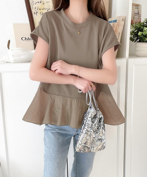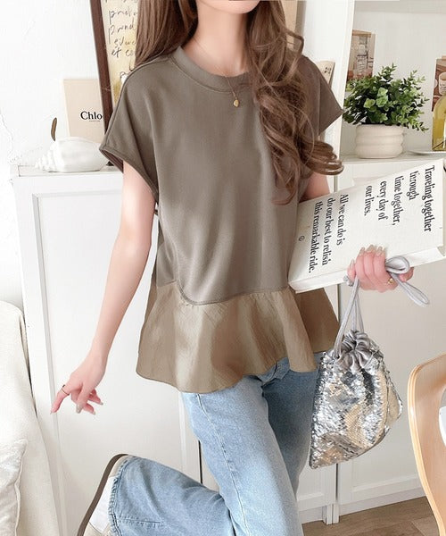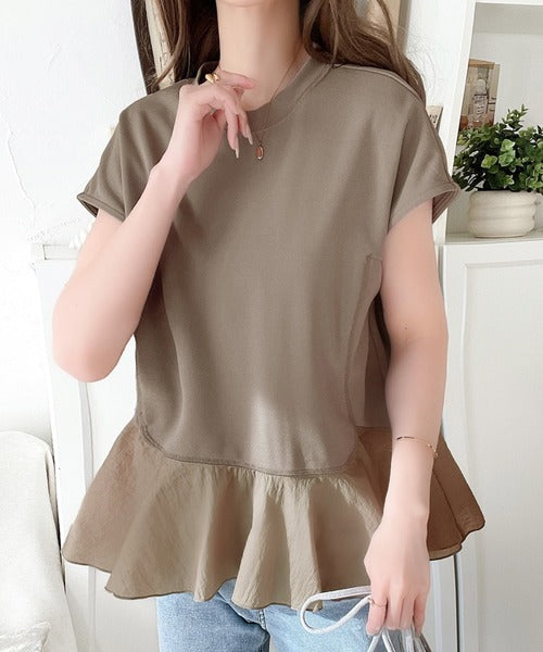 楽ちんなのに上品見え!裾フレア異素材切替フレンチスリーブブラウス ce1110103