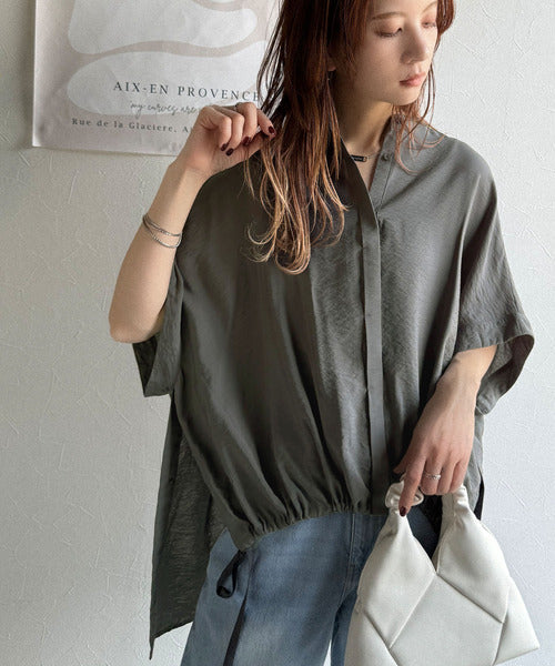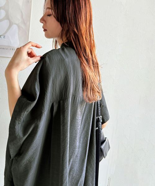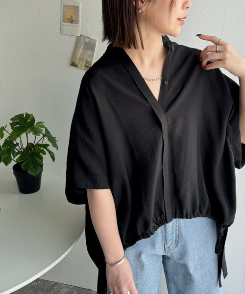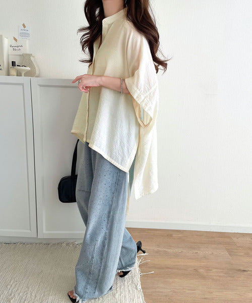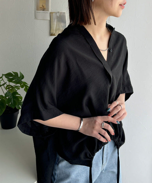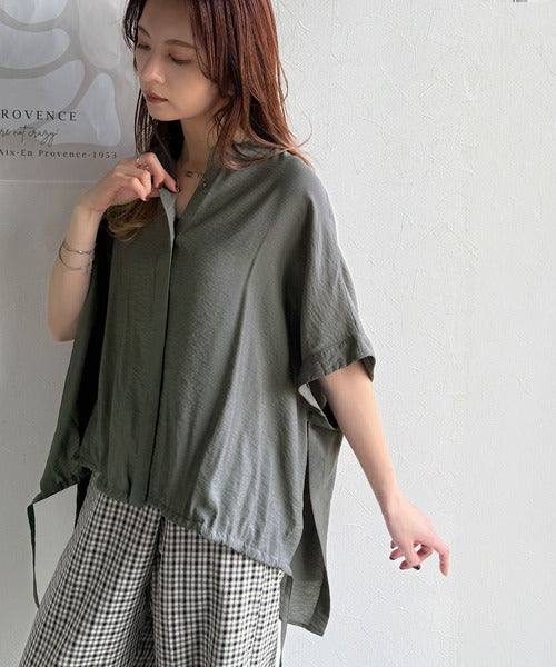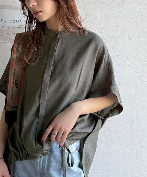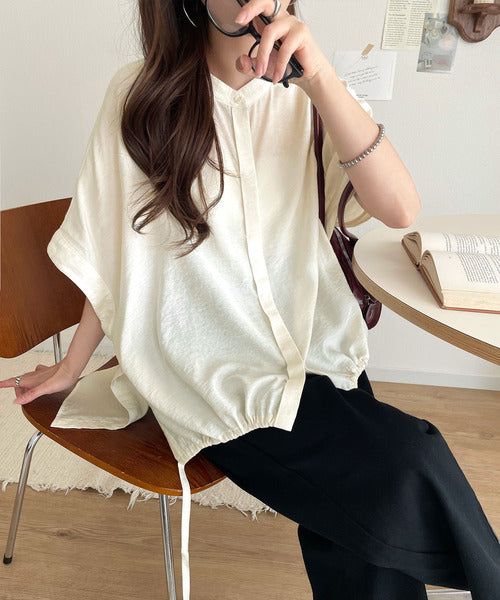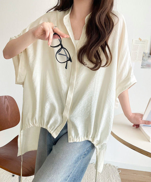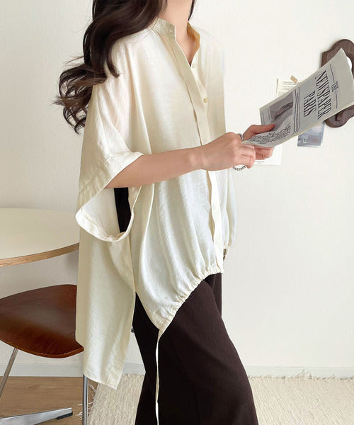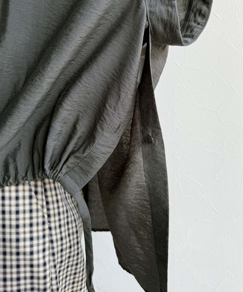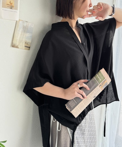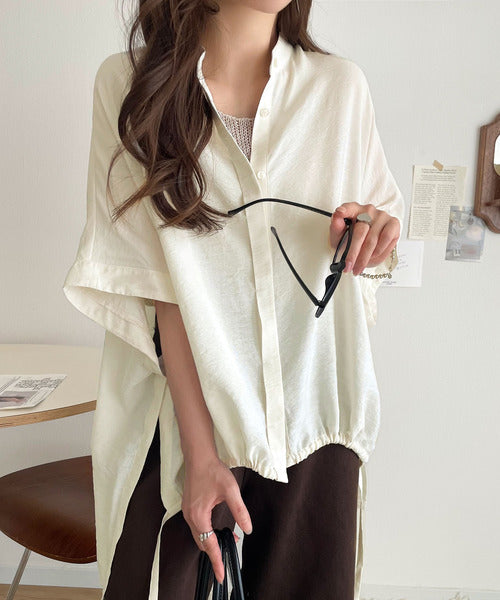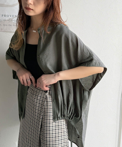 トレンド満載オーバーシルエット♪シボ感シアーサイドボタンスリット裾ドロストシャツ ce1110112