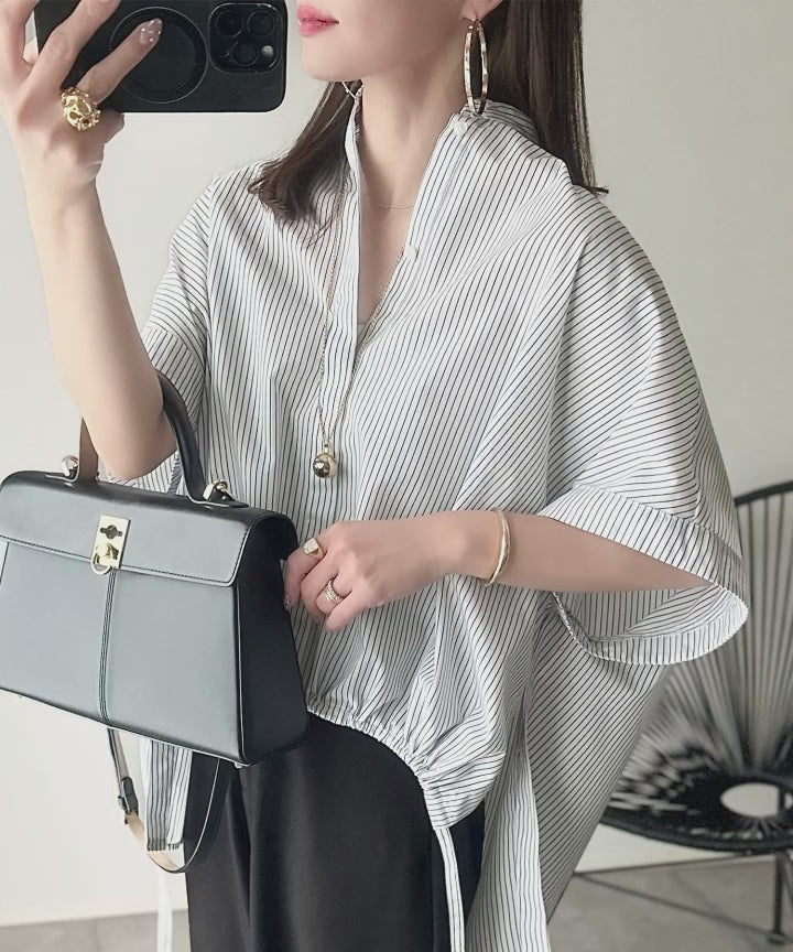 たっぷりの前ドロストデザインが目を引く、大人の抜け感シャツ。
