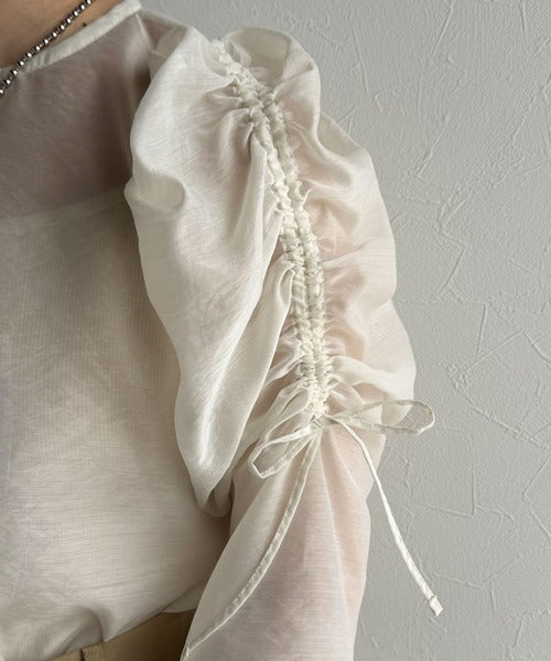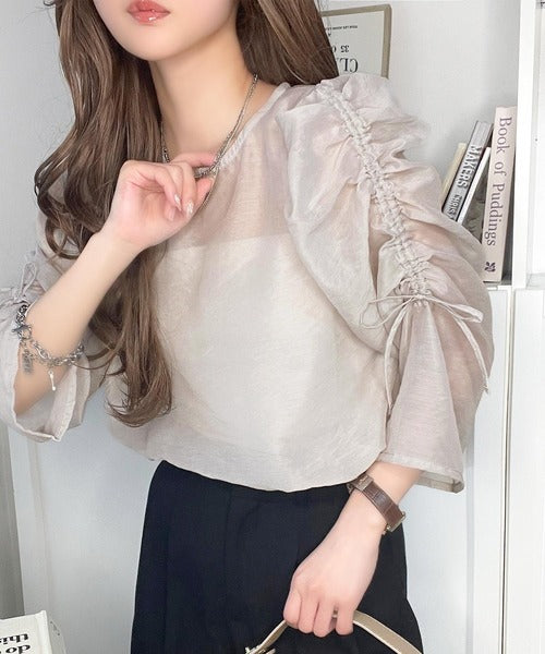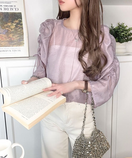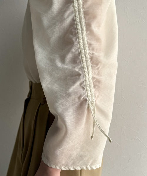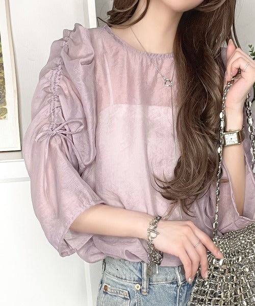 袖のギャザーの分量をドロスト紐で調整できる、大人かわいいブラウス。