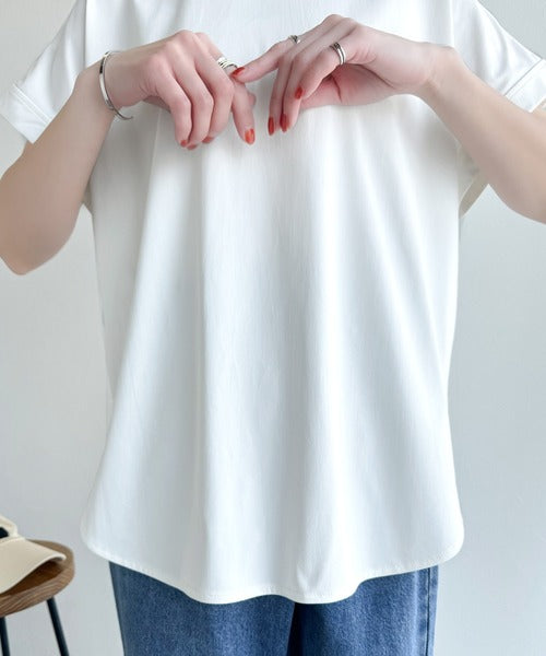 シンプルでありながらも、布帛ライクな高機能カットソー素材を使用した1枚。