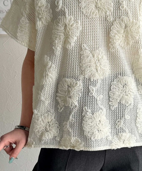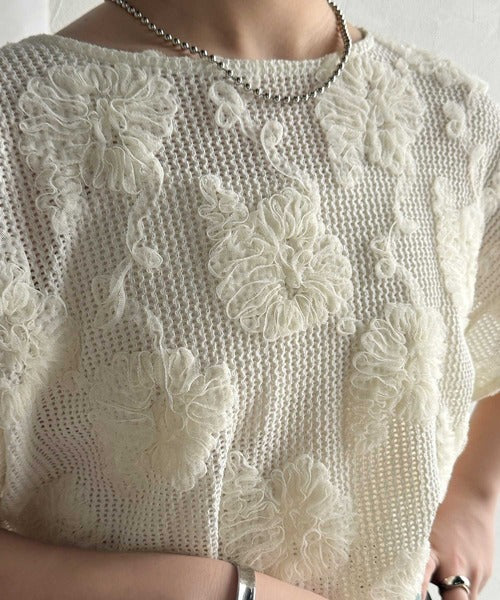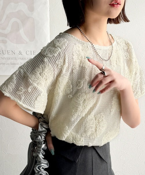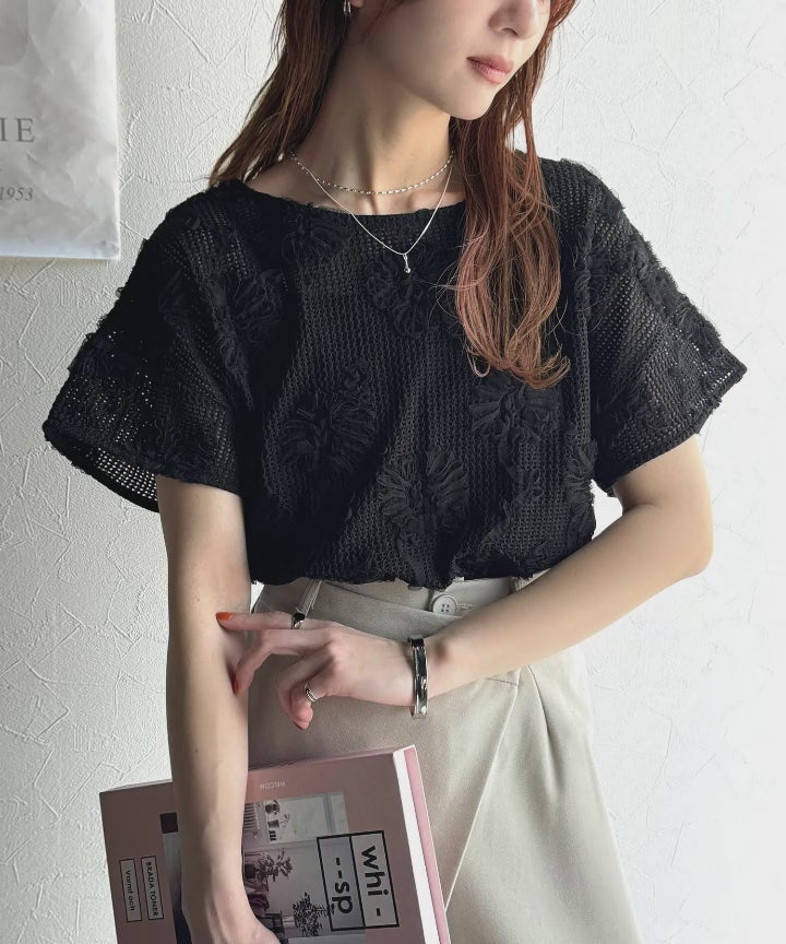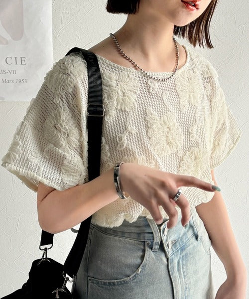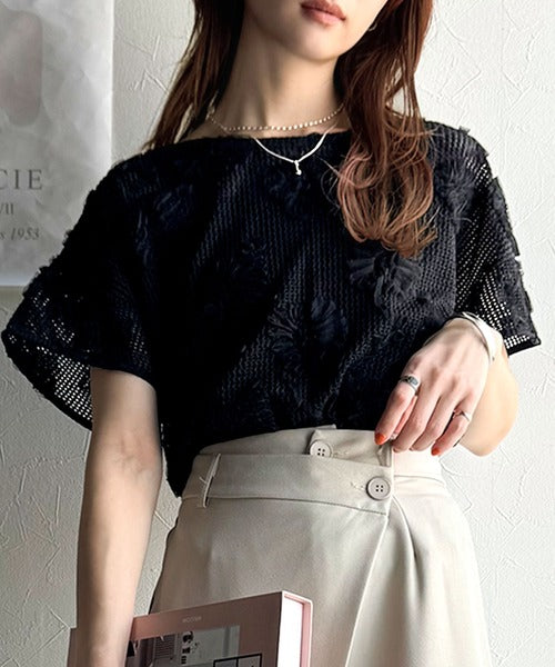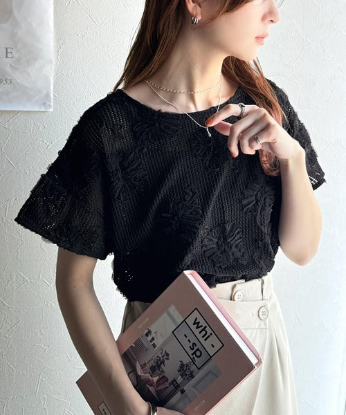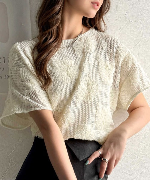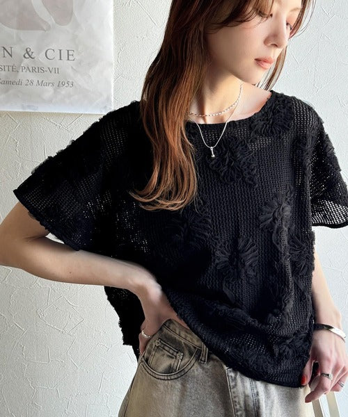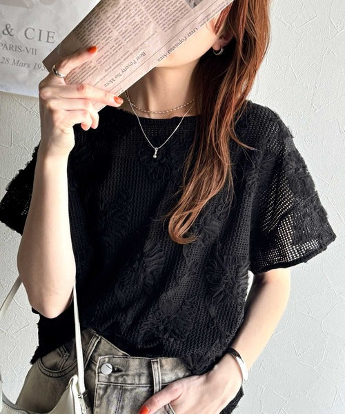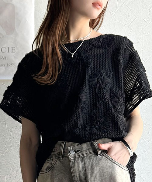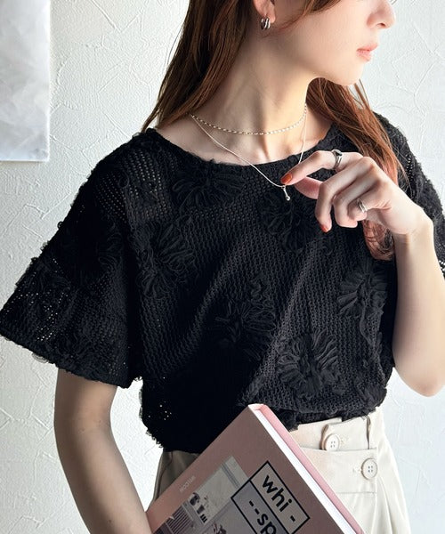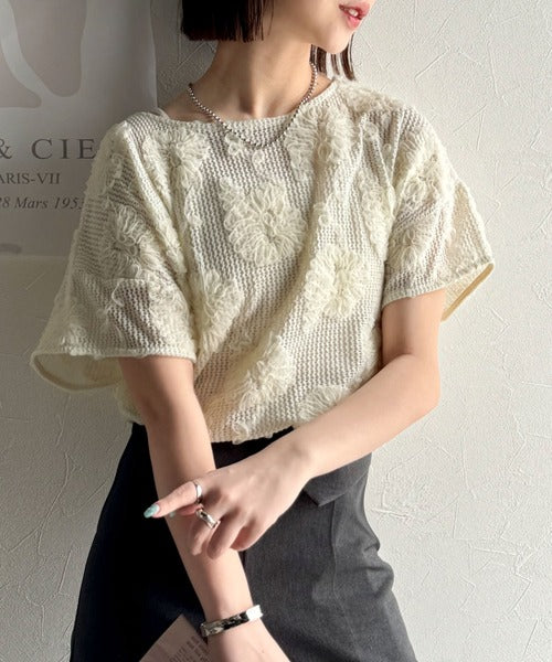 大人のおしゃれ度ワンランクアップ。チュールフラワーコード刺繍半袖Tシャツ ce1260429