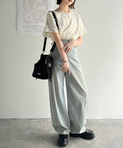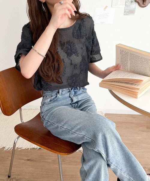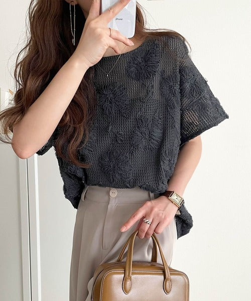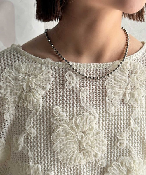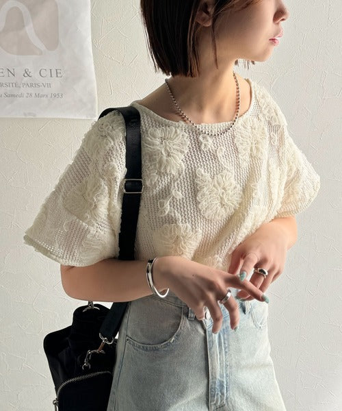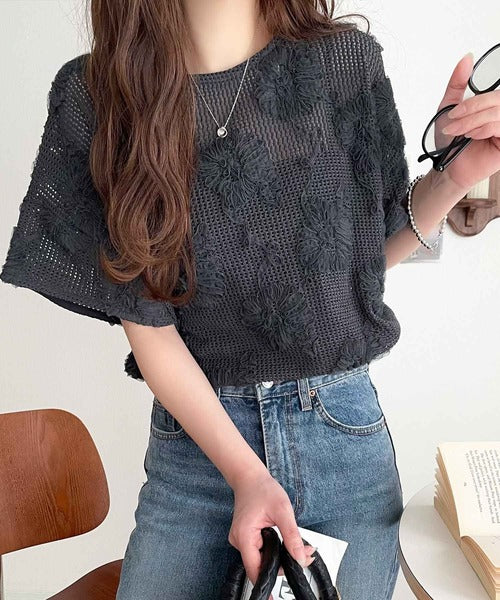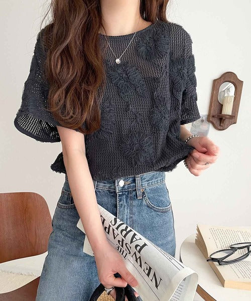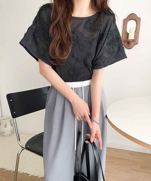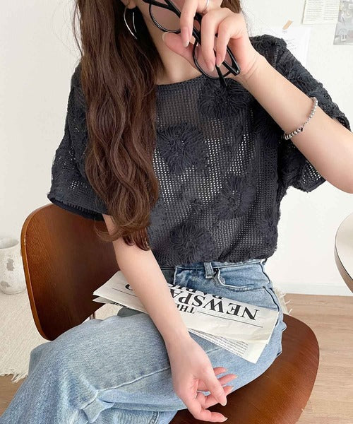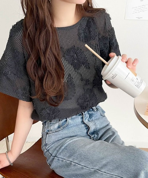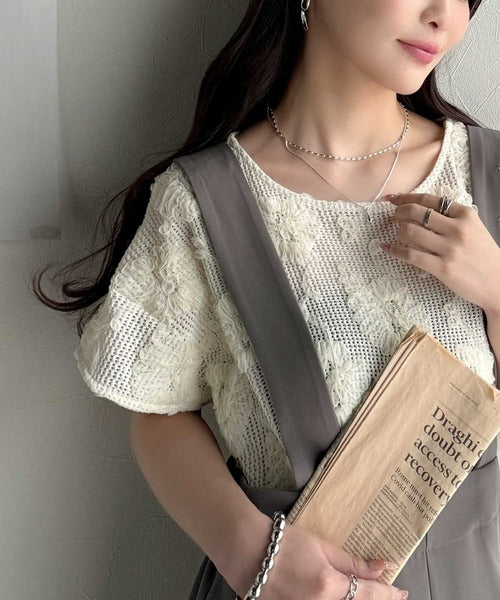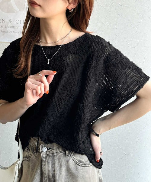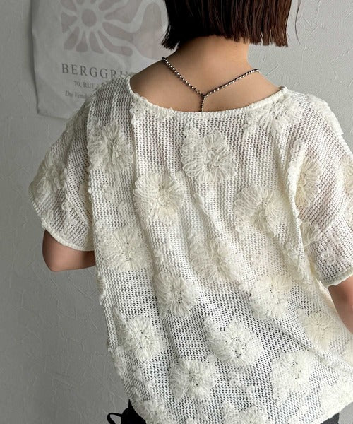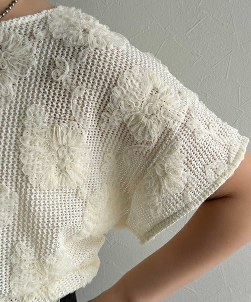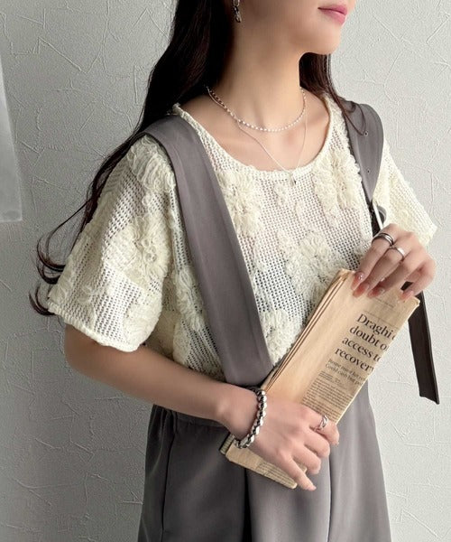 大人のおしゃれ度ワンランクアップ。チュールフラワーコード刺繍半袖Tシャツ ce1260429