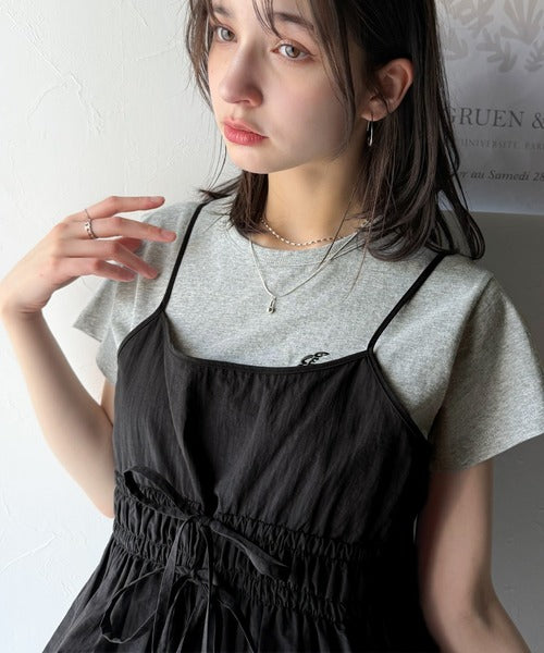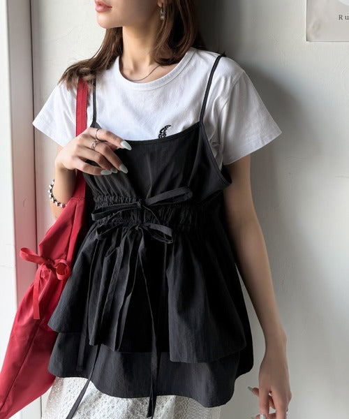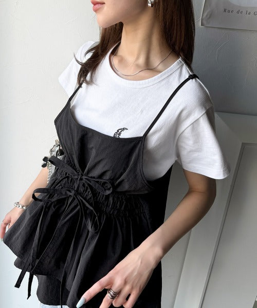 旬のレイヤードスタイルがこれ一着で即完成。ダブルリボン使いキャミ&ムーン刺繍半袖Tシャツセット ce1265004