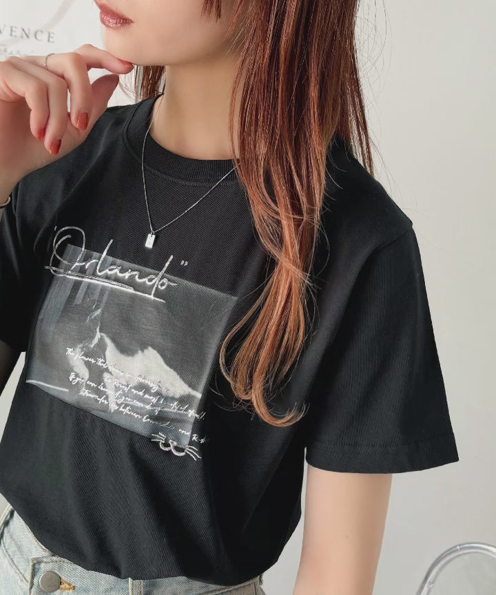 こちらのシルケット風猫フォト箔×刺繍Tシャツは、トレンド感あふれるデザインが特徴。