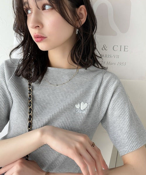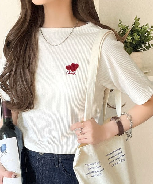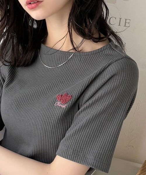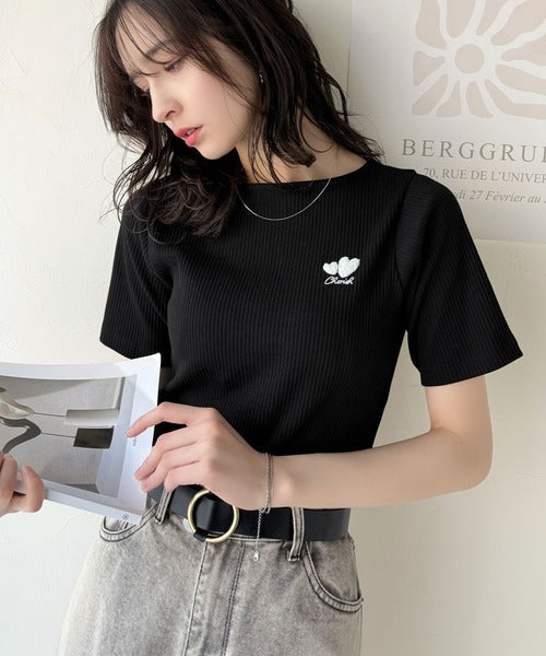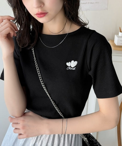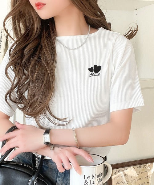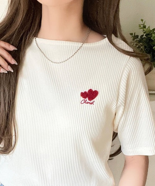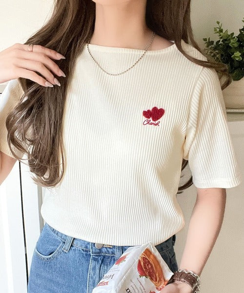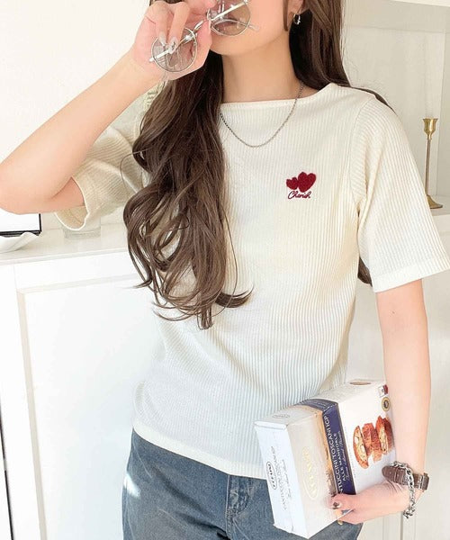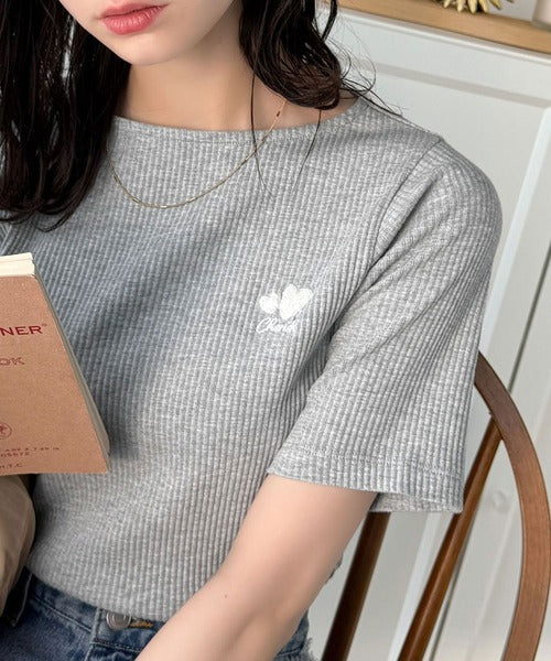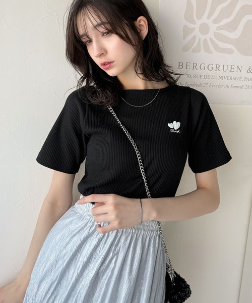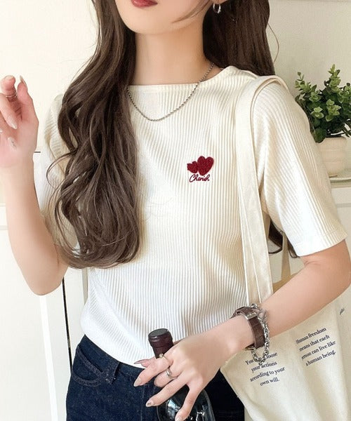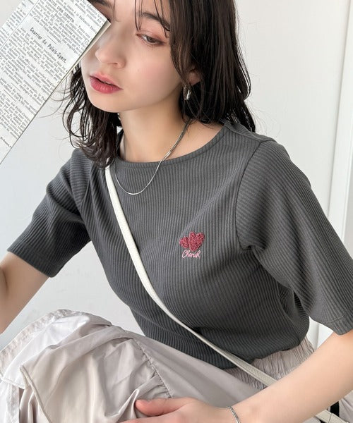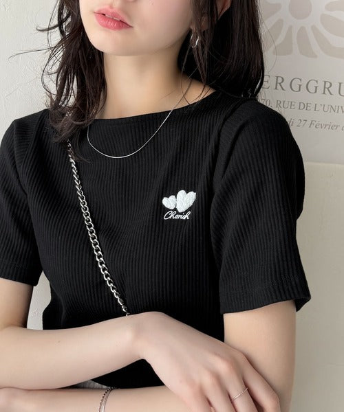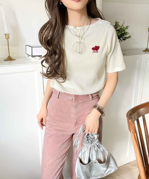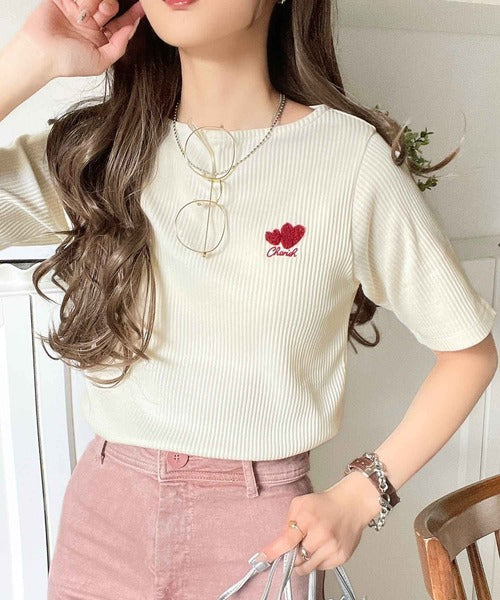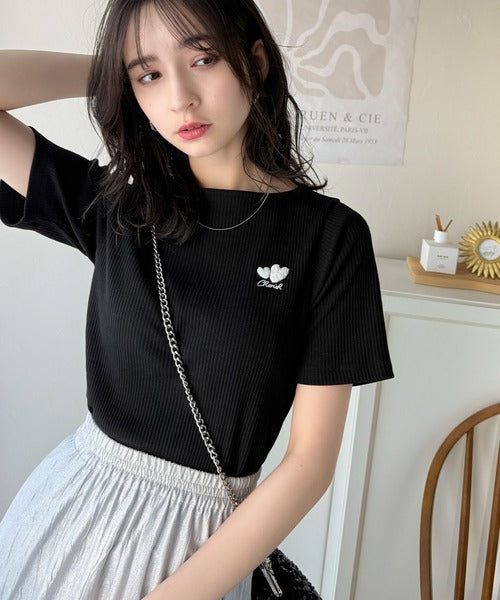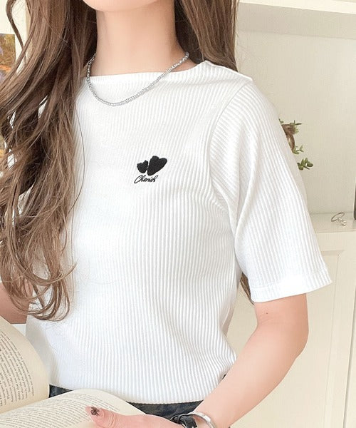 胸元にキュン。ハートサガラ刺繍テレコリブ素材ボートネックTシャツ(半袖) ce1330019