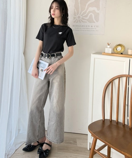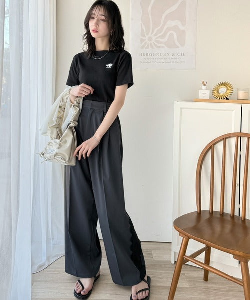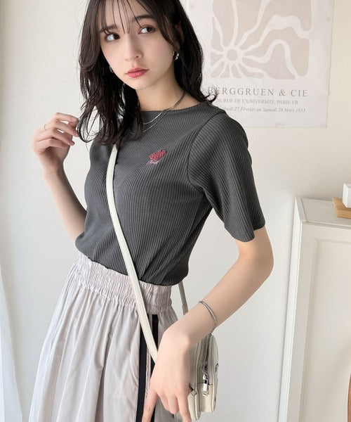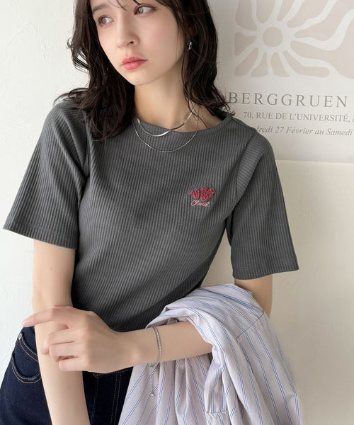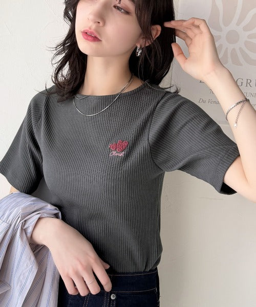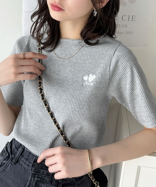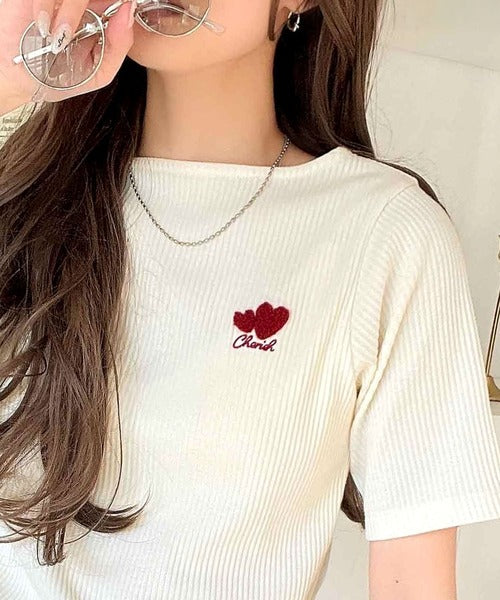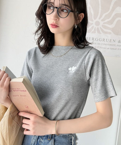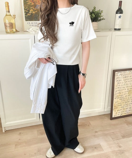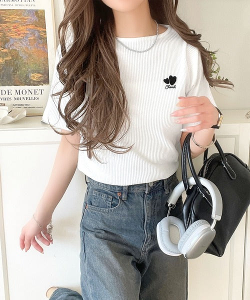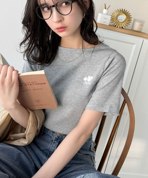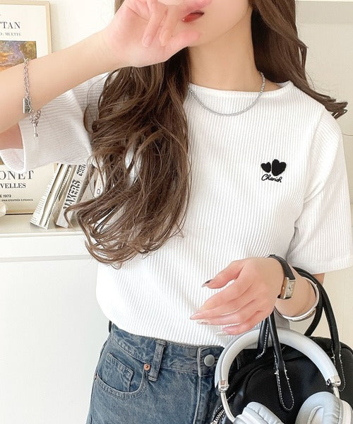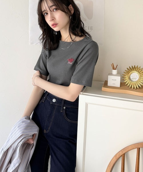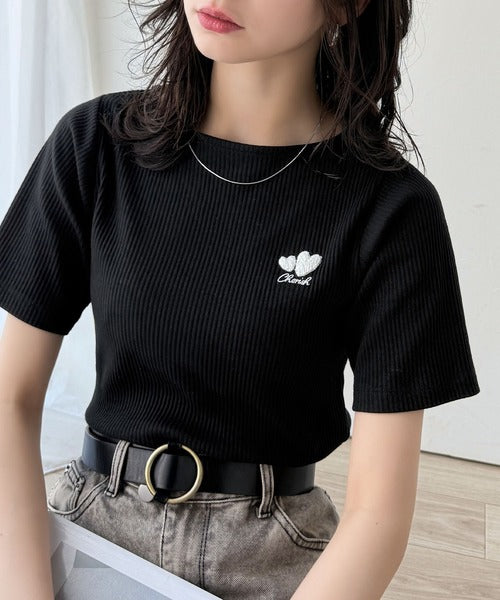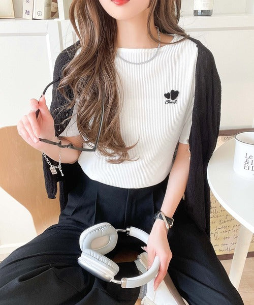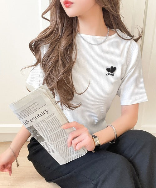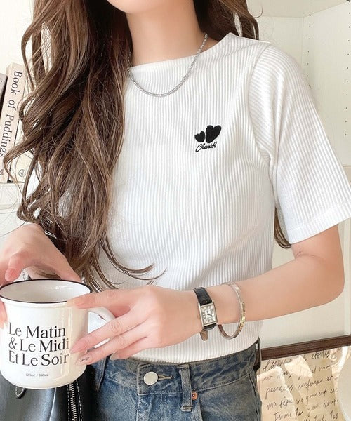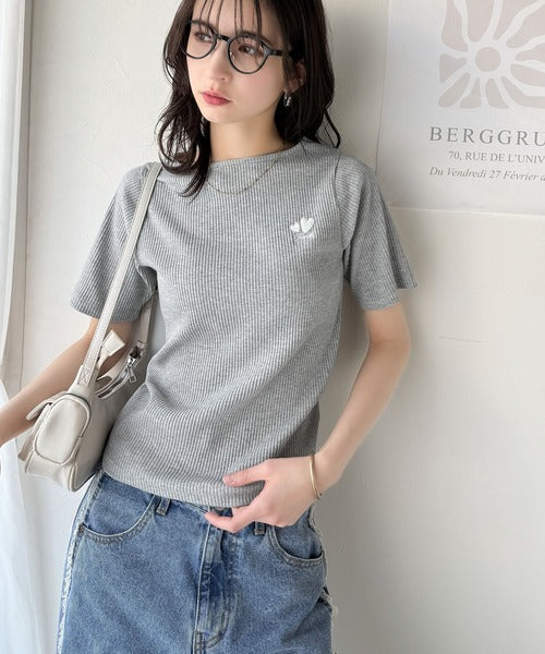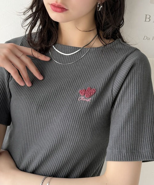 胸元にキュン。ハートサガラ刺繍テレコリブ素材ボートネックTシャツ(半袖) ce1330019