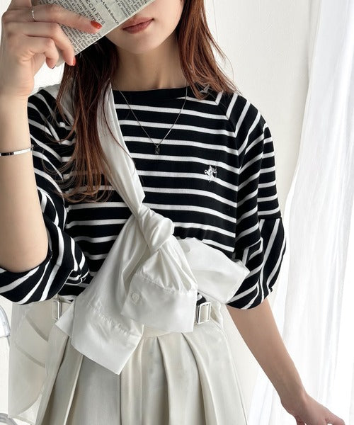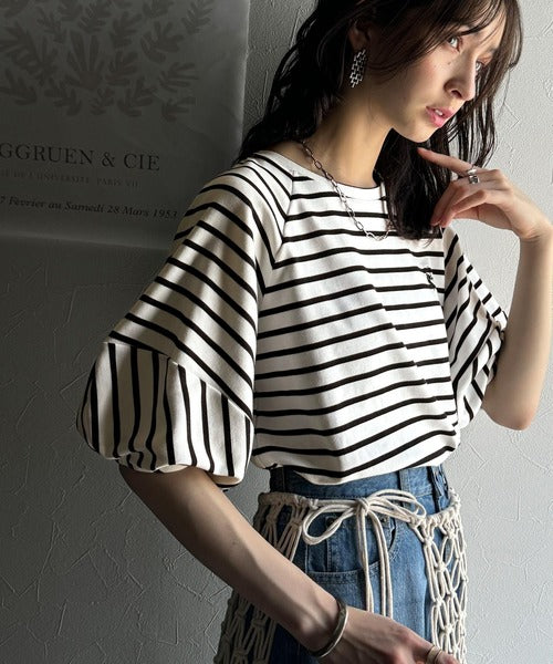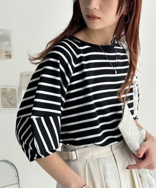 大人の上品シンプル。ワンポイント刺繍ランタンスリーブボーダートップス ce1330024