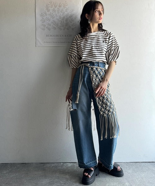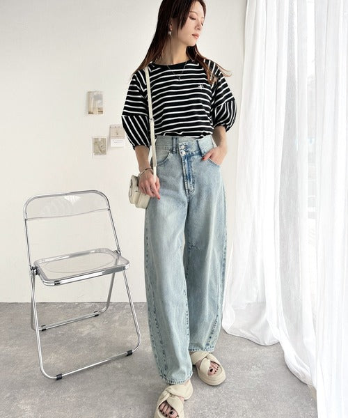 ベーシックなボーダートップスなので、ボトムを選ばず