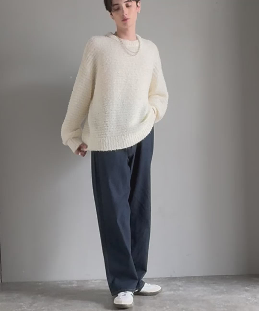 リラックス感あふれるクルーネックニットトップス。
