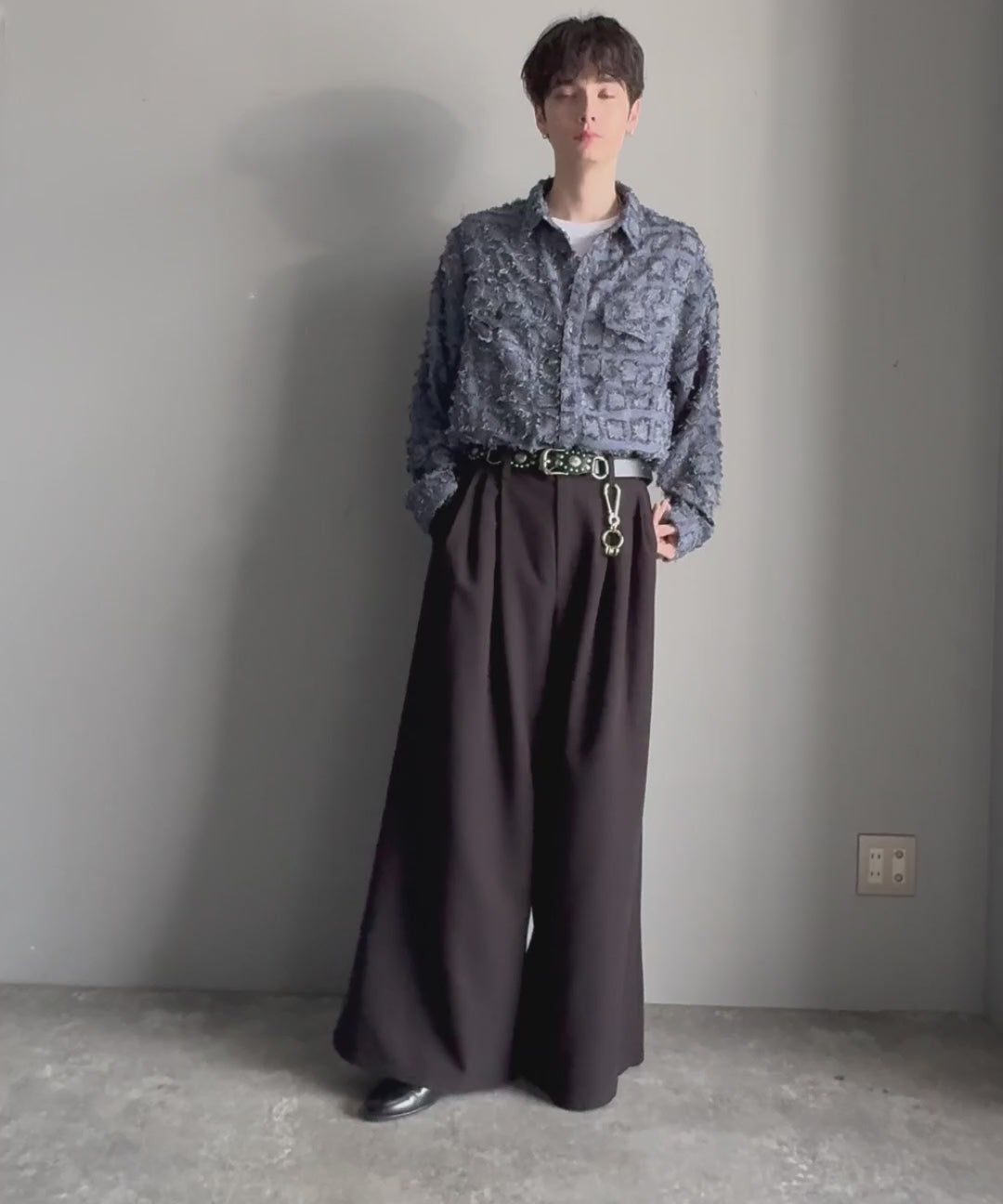フリンジ使いブロックチェックアウターシャツは、存在感のあるデザインが特徴。