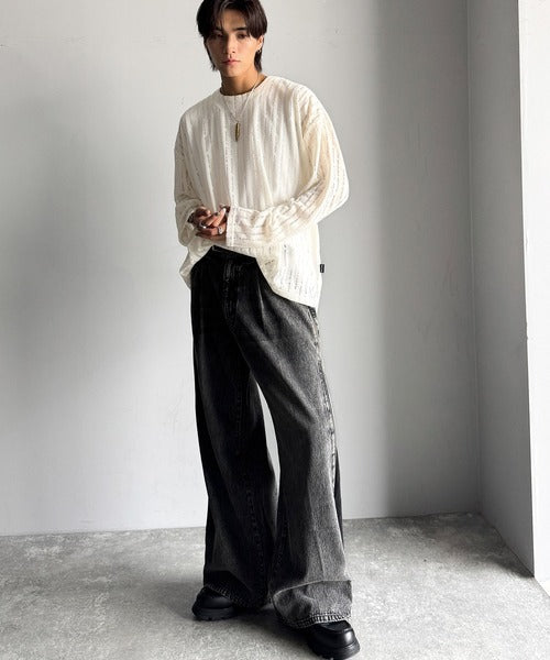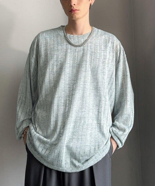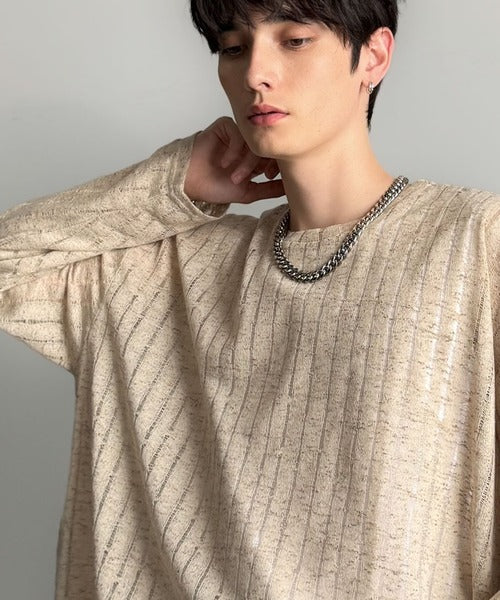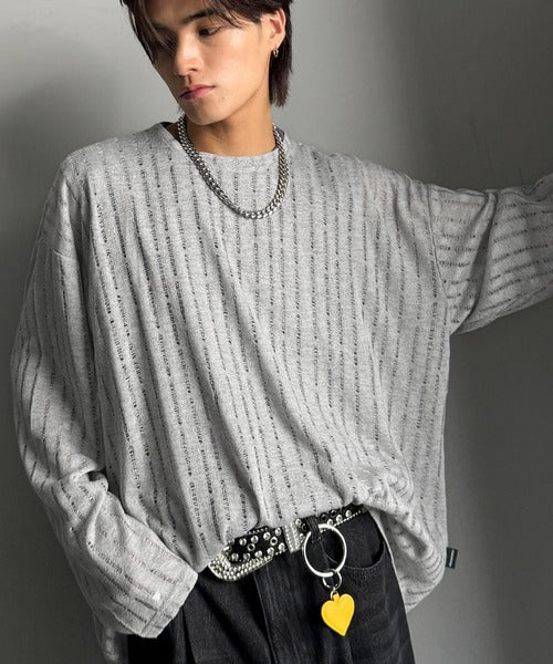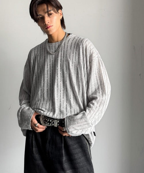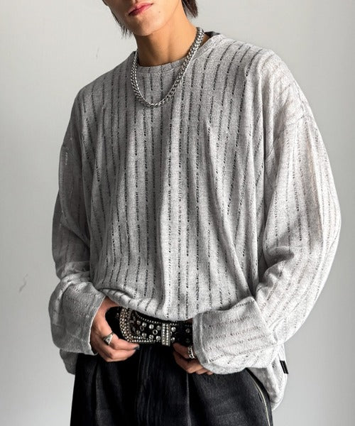 ダメージ加工が施されたクルーネックプルオーバーは、柔らかく透け感のあるシアーニット素材を使用し、