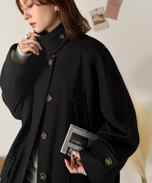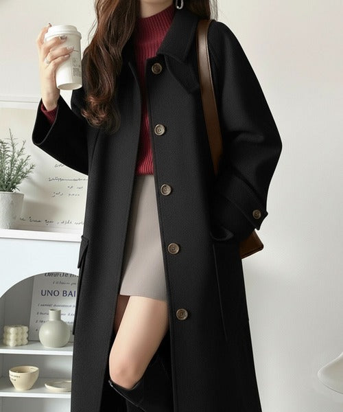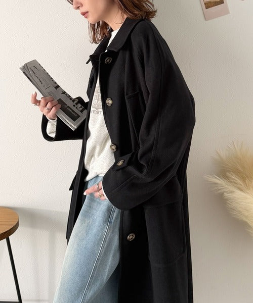 シンプルながらも高級感あふれるロング丈比翼ステンカラーコート。
