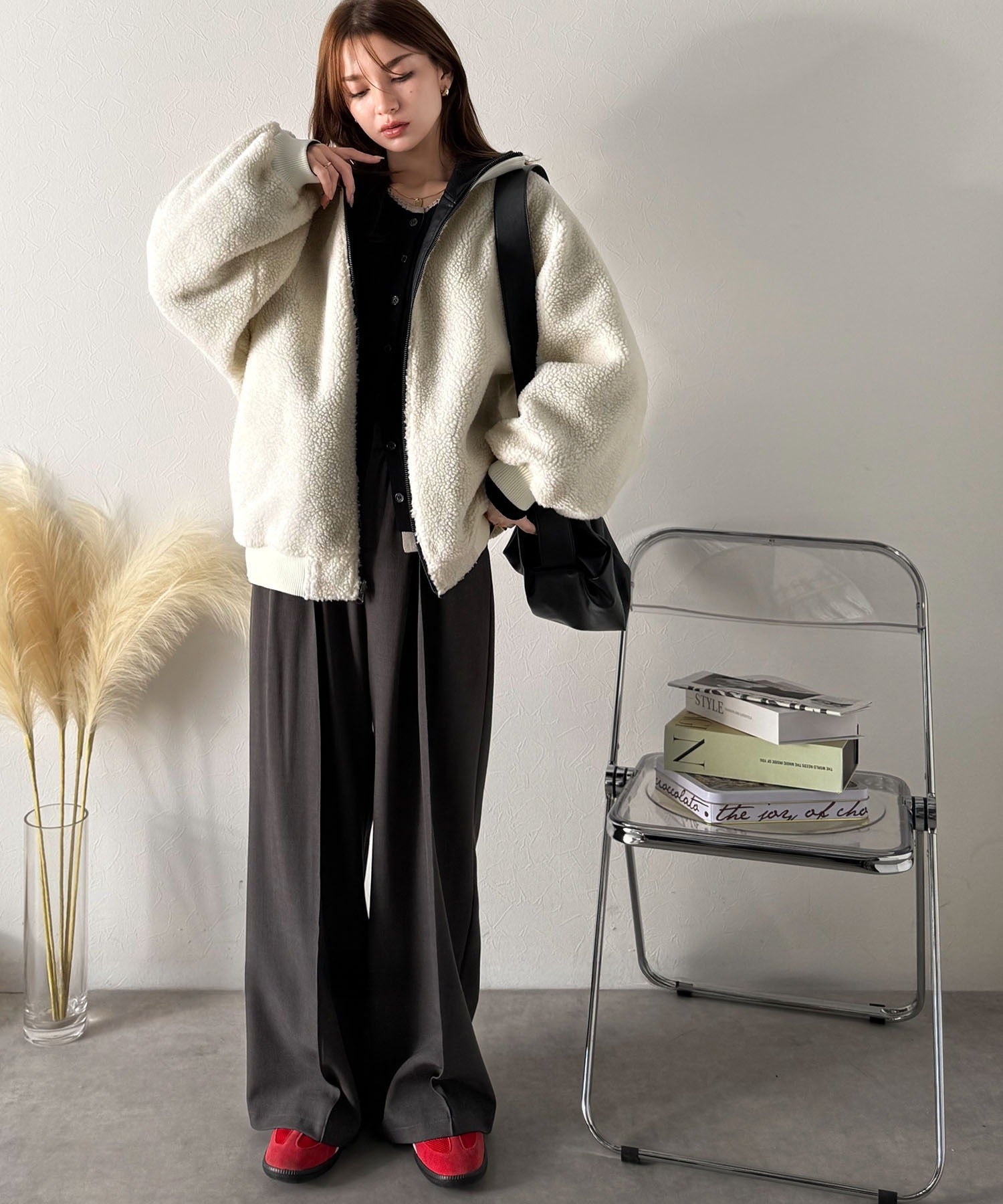 足元にパンプスやブーツを持ってくることで、全体のバランスを取ります。