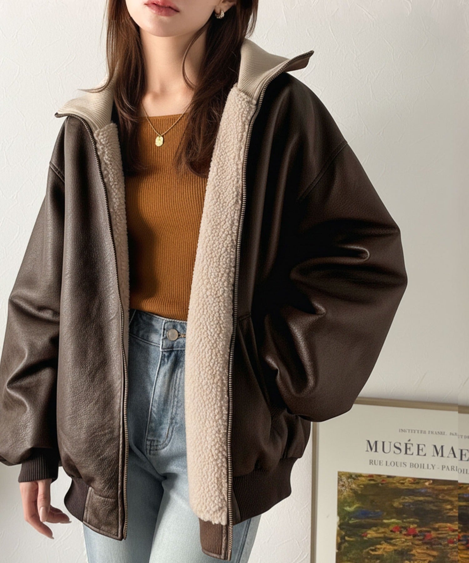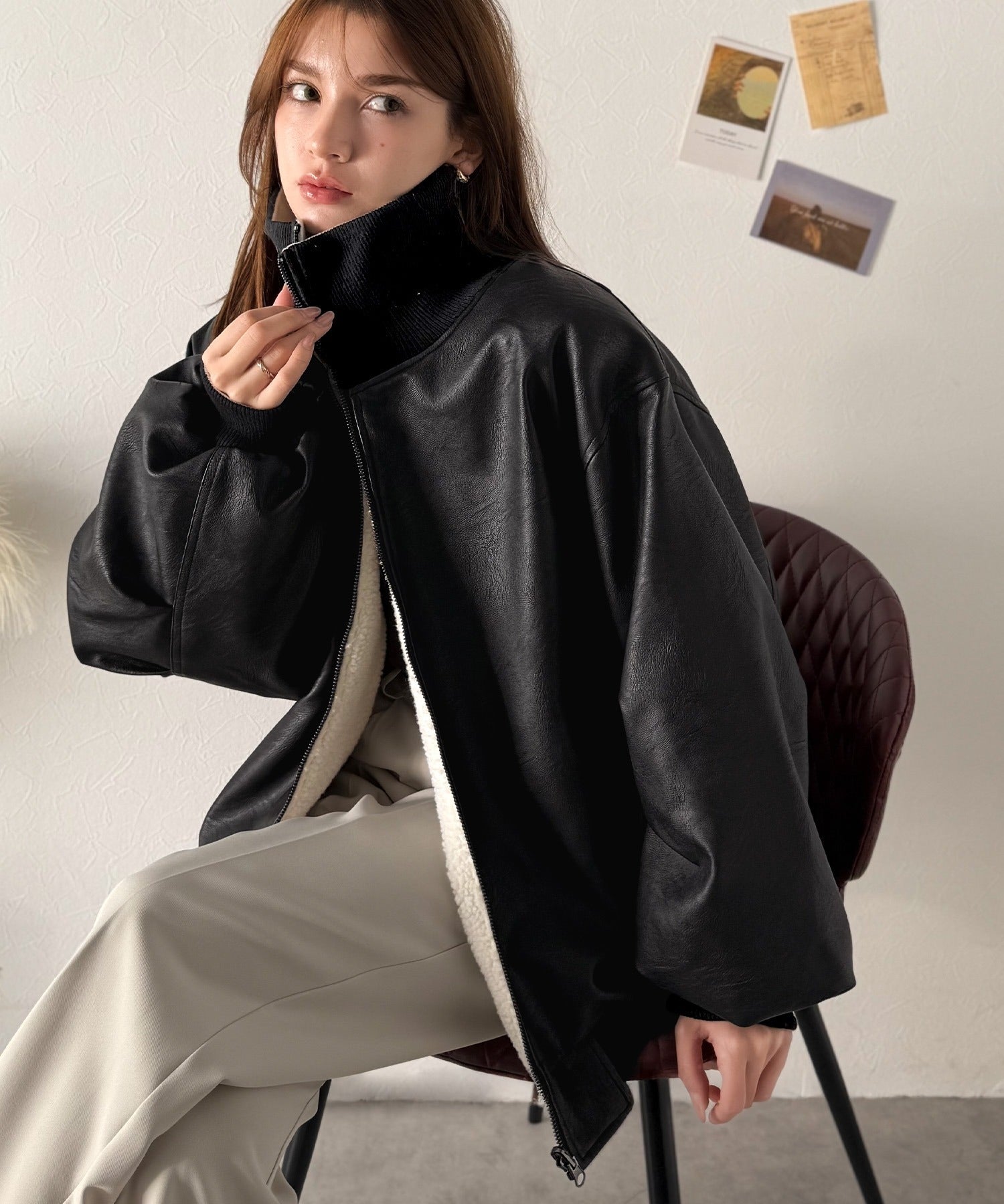 スタイリッシュなフェイクレザー×ボアブルゾン。