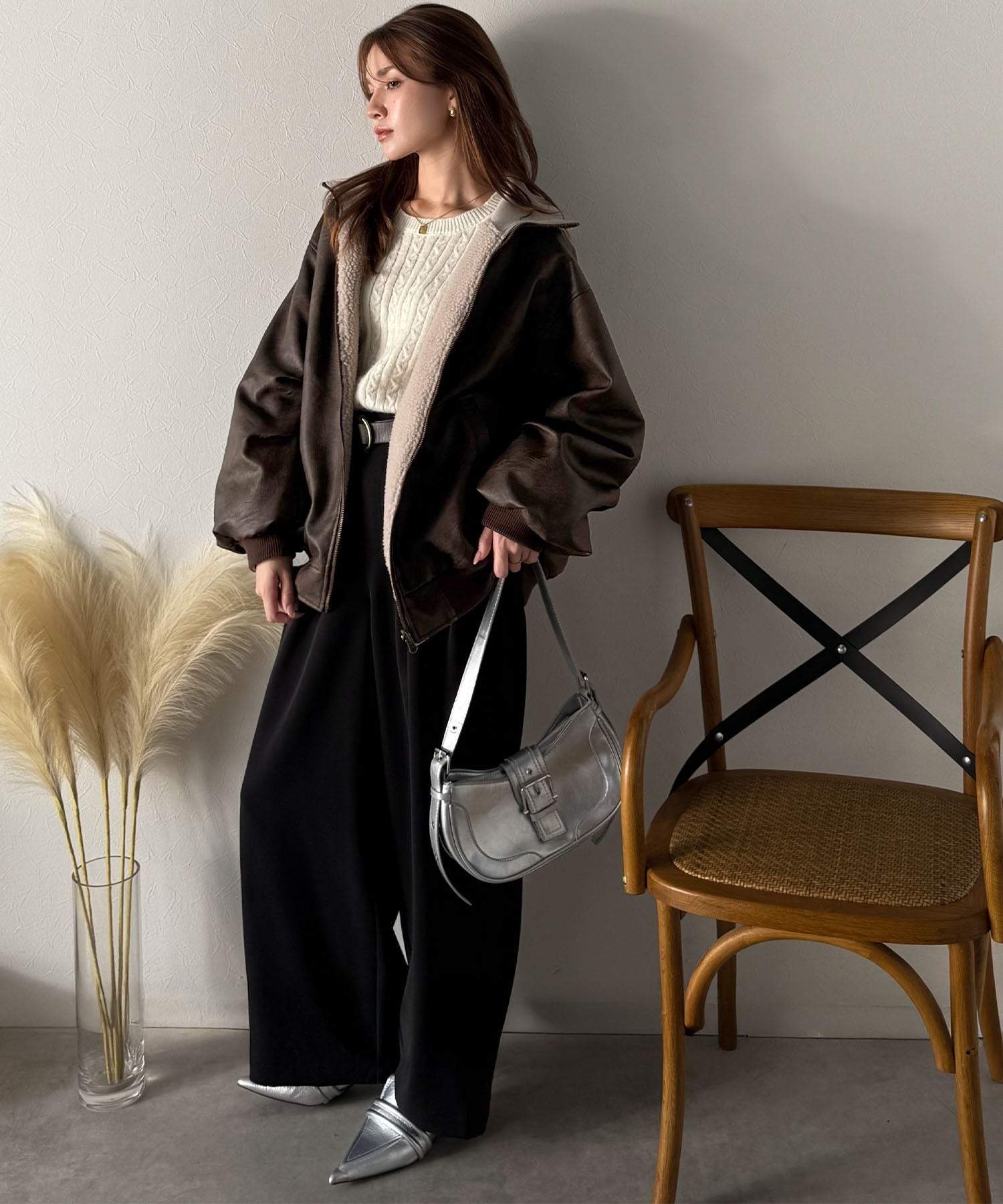 温かみのあるボア素材と、リアルレザーさながらのヴィンテージ感漂うフェイクレザーの組み合わせが魅力。