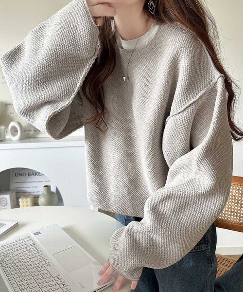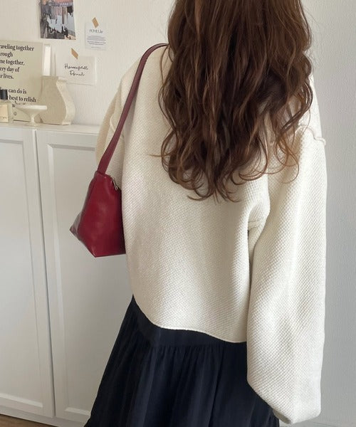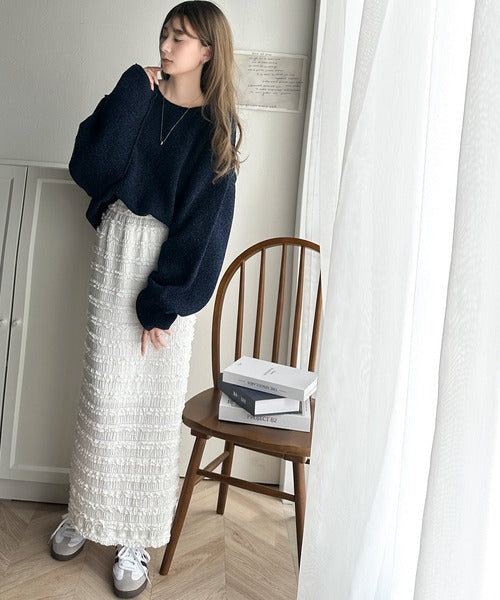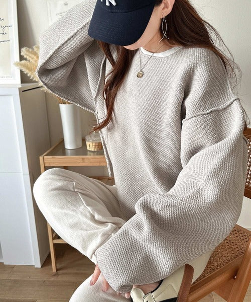 モール糸を表面感豊かなジャカード編みで仕立てたので、微妙な色差がニュアンスカラーを生み出します。