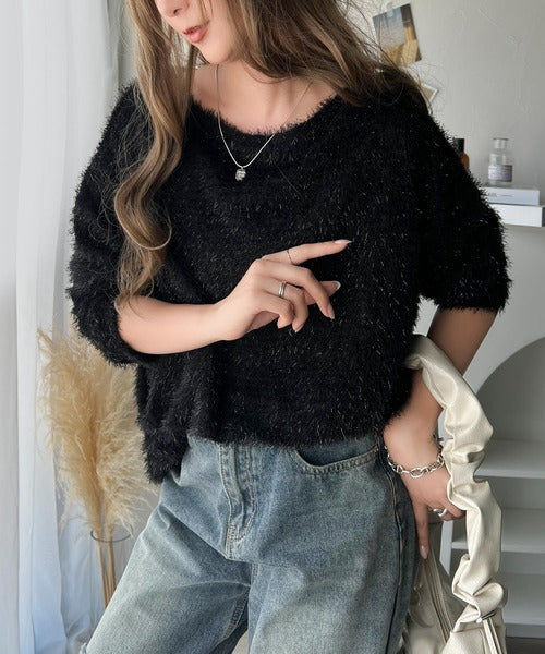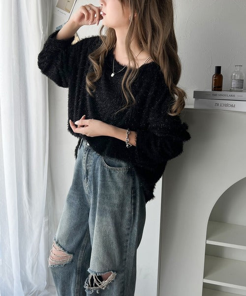 華やかで洗練されたデザインのボートネックラメシャギープルオーバーは、