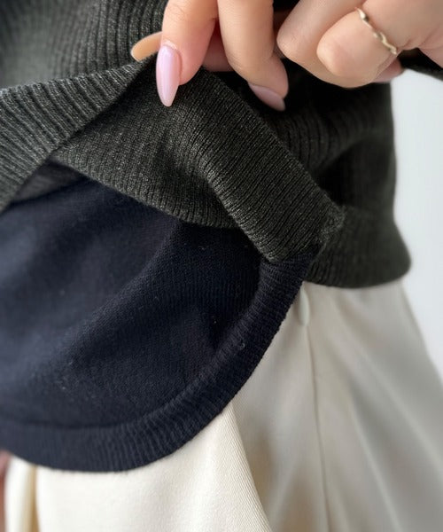 レイヤード風のフェイクデザインが、視線を引きつけるプルオーバーニット。