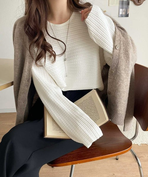 シンプルなデザインで、どんなコーディネートにも合わせやすいクルーネックリブ編みプルオーバー。