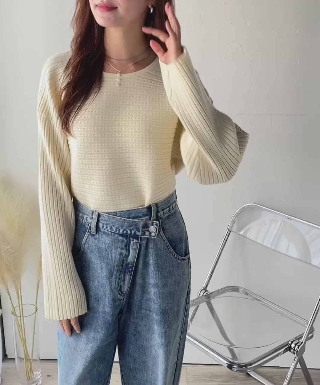 ボリューム袖でゆるっとかわいく、クルーネックで大人キレイに。