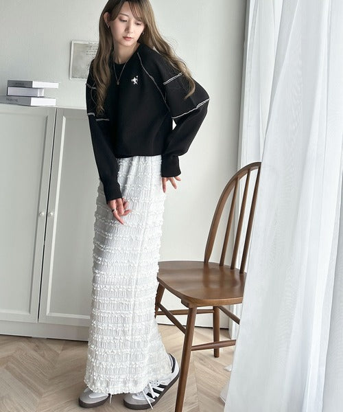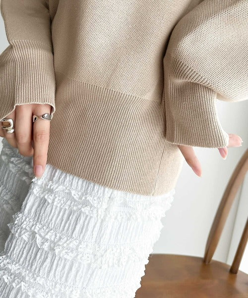 女性らしいフレアスカートやワイドパンツなどボリュームボトムスとも好相性◎