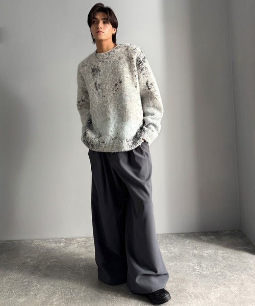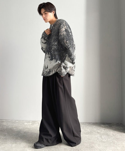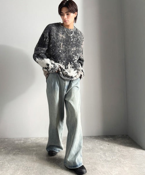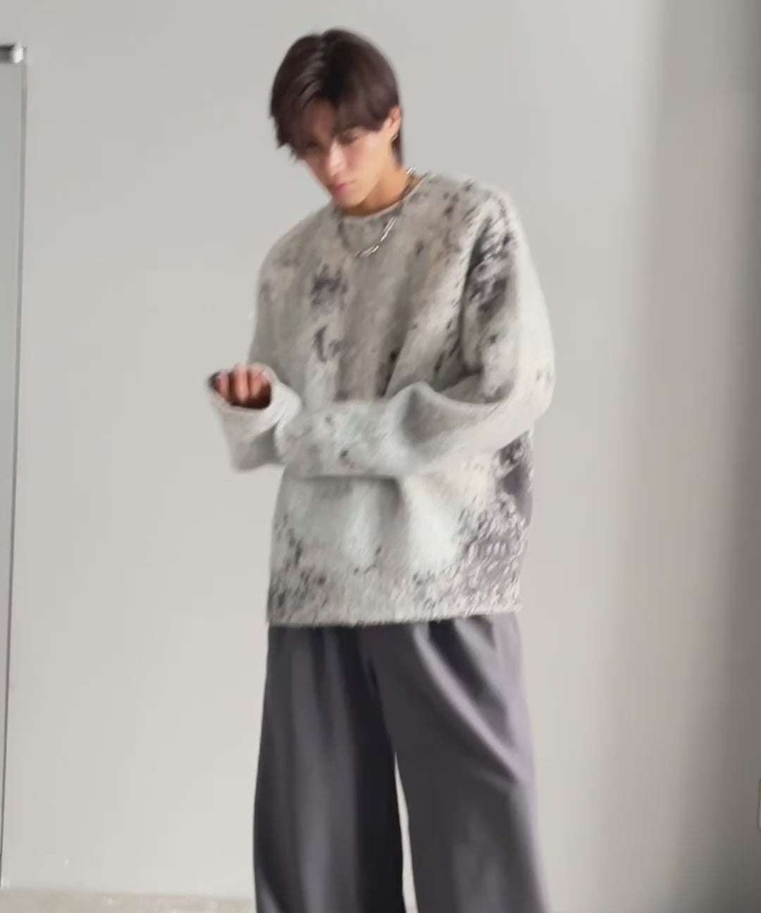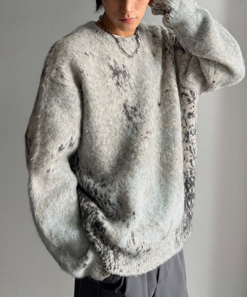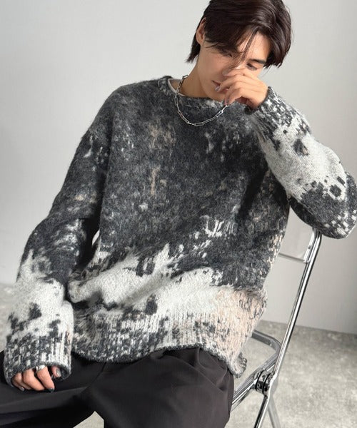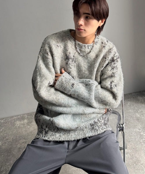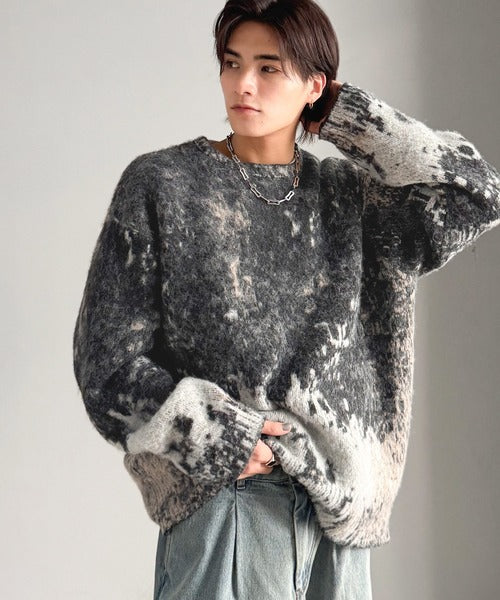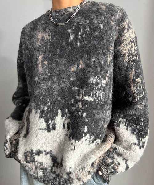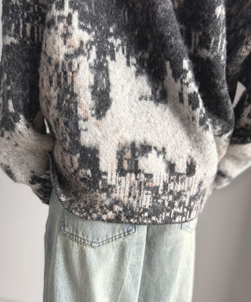 印象的なアブストラクト柄の起毛ニットプルオーバー。