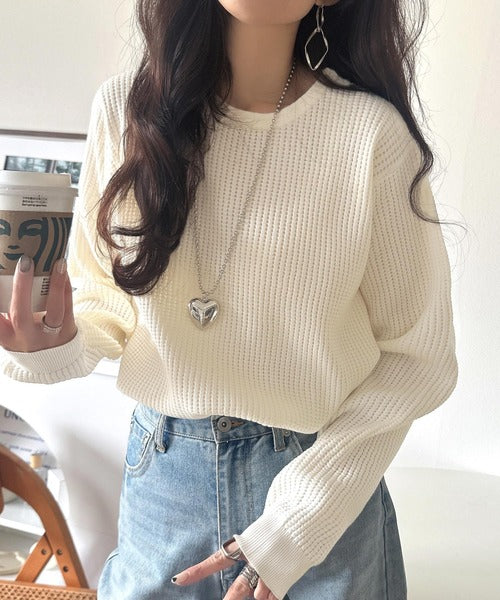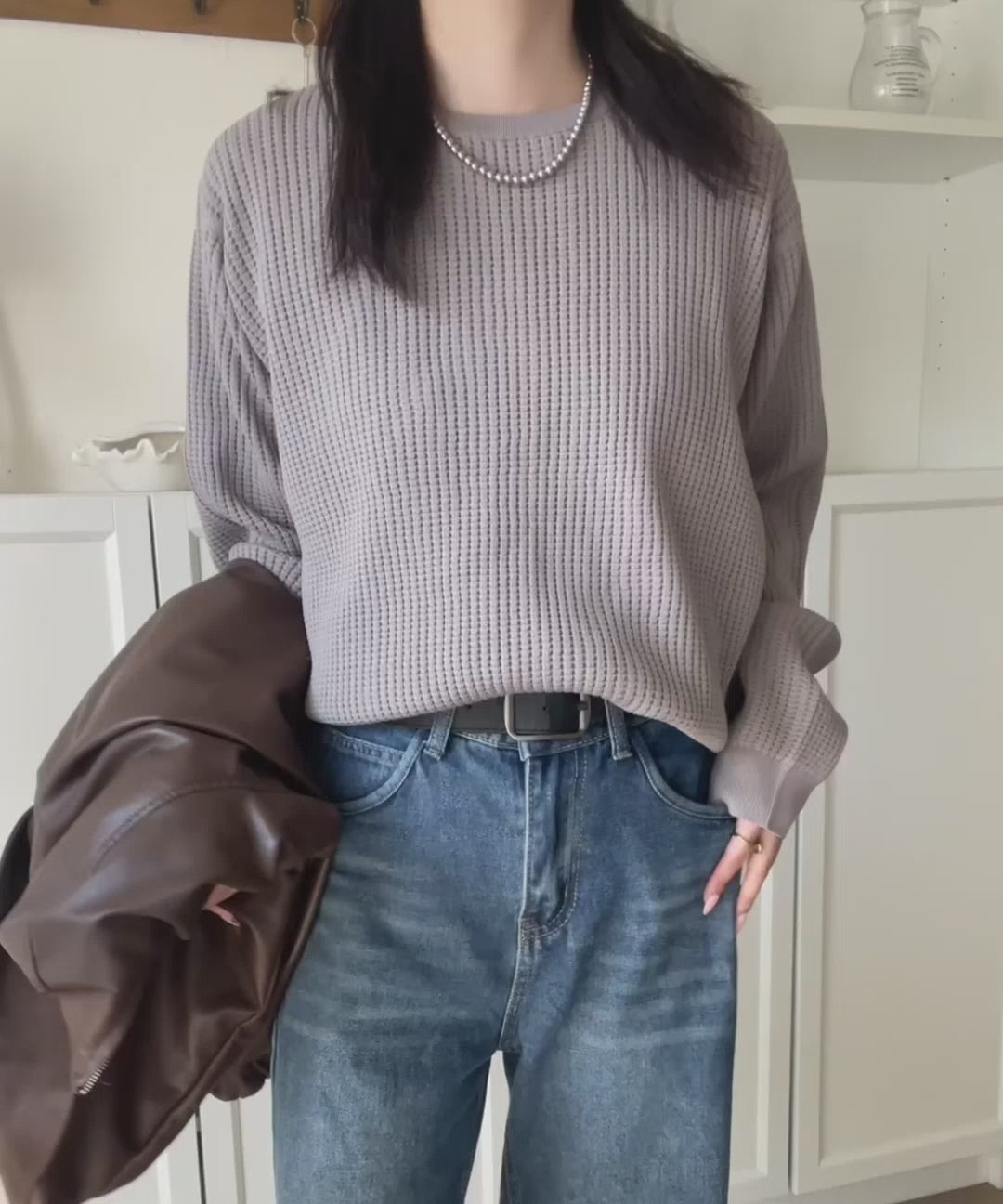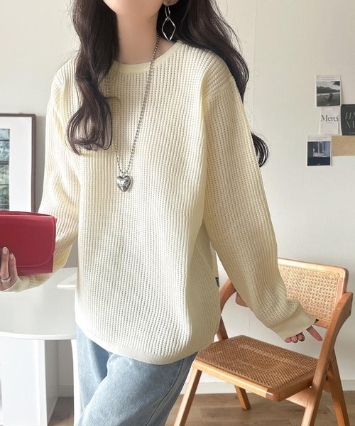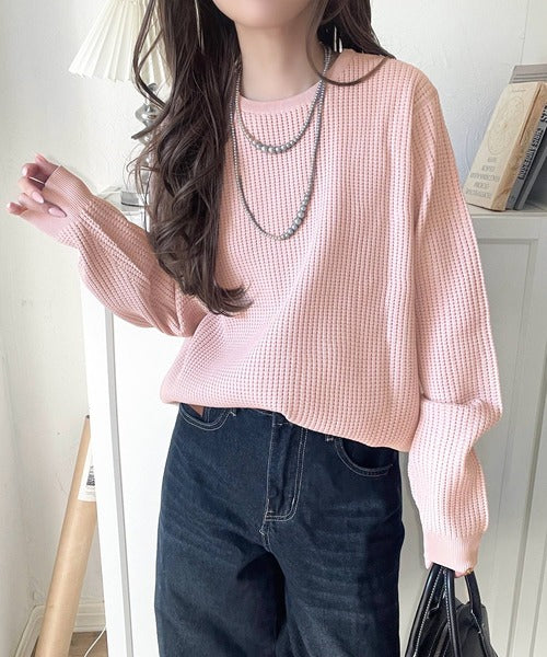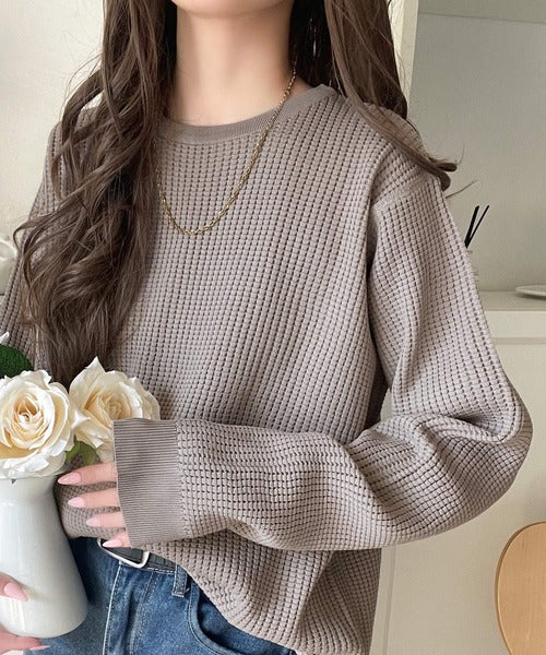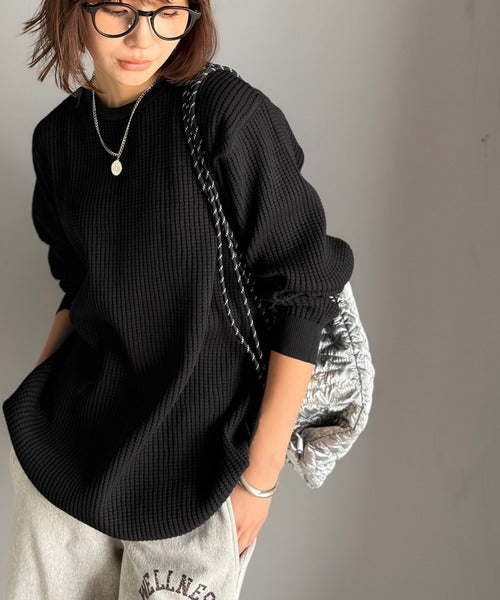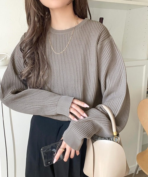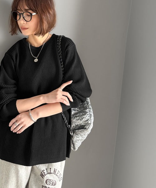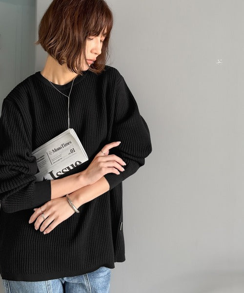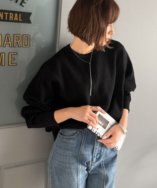 サーマルクルーネックニットは、程よい厚みと独特のワッフル編みが特徴。