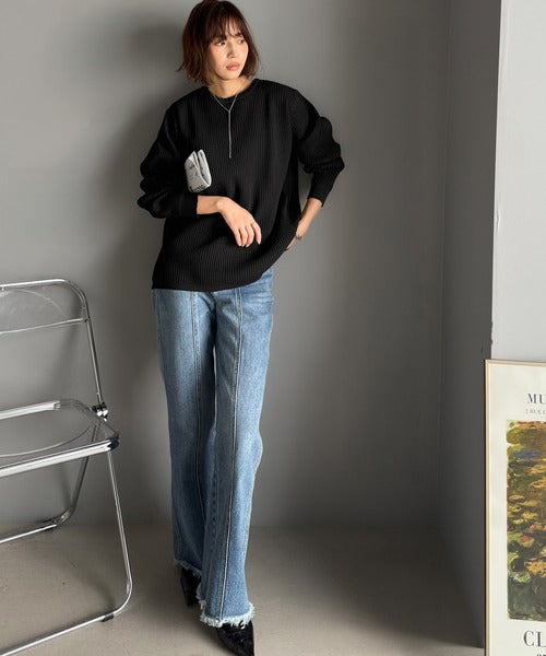 パンツにもスカートにも合わせやすい絶妙な丈感で、インでもアウトでも着こなしが決まる優秀ニット。