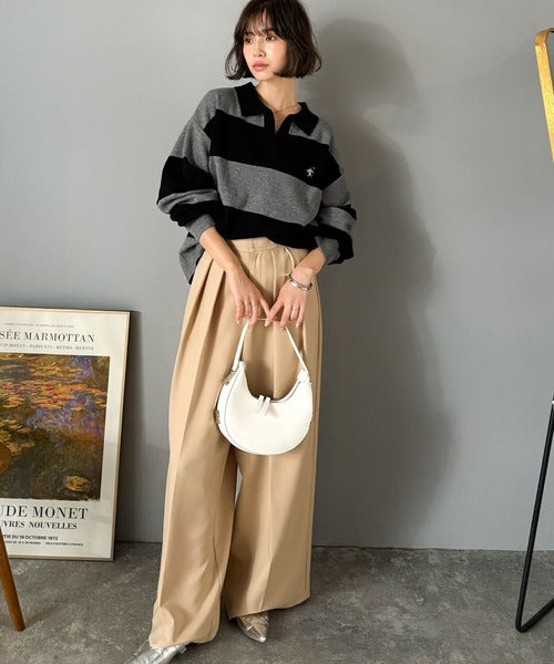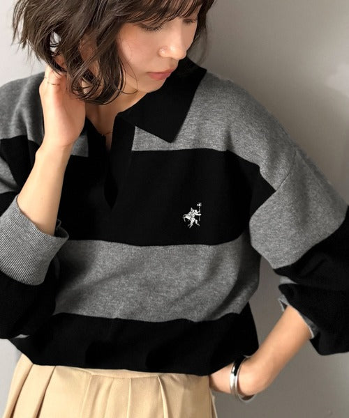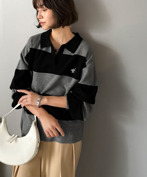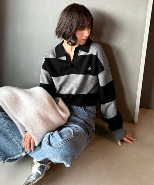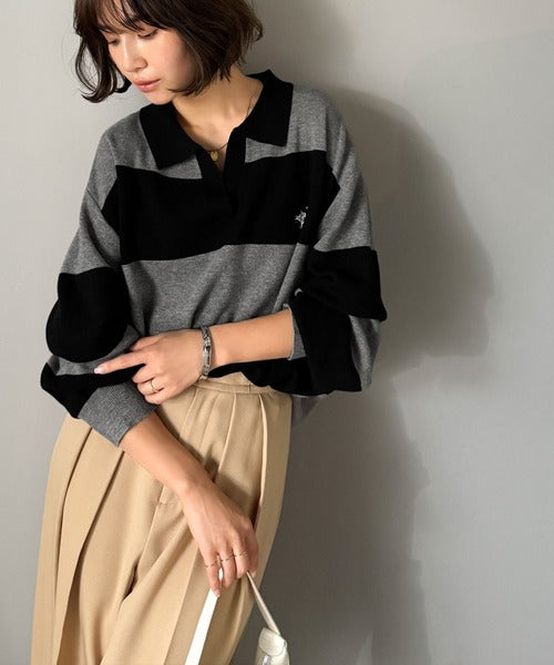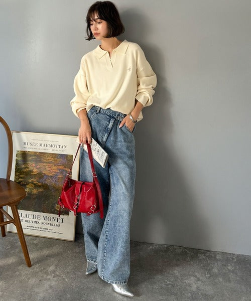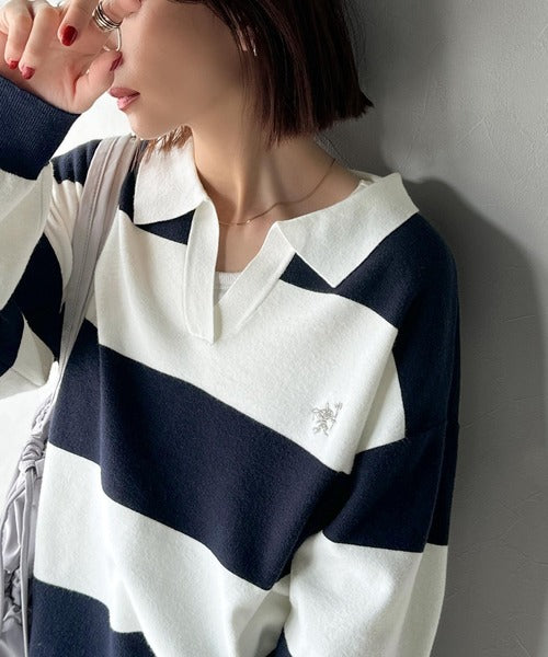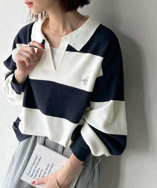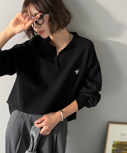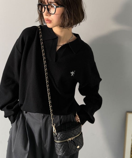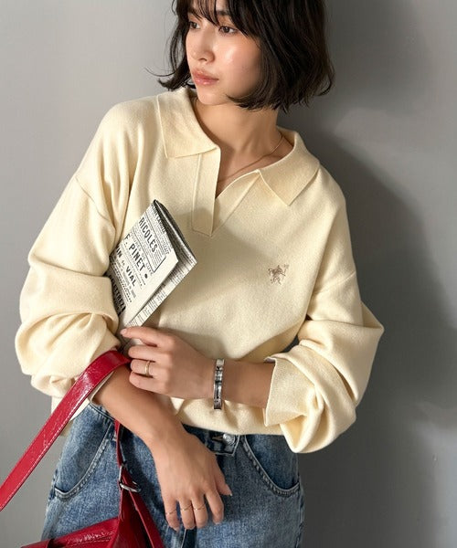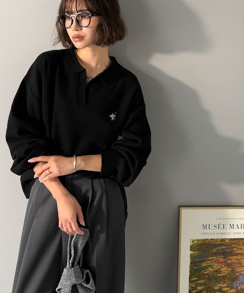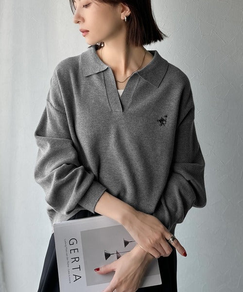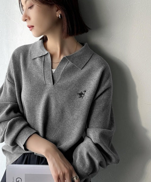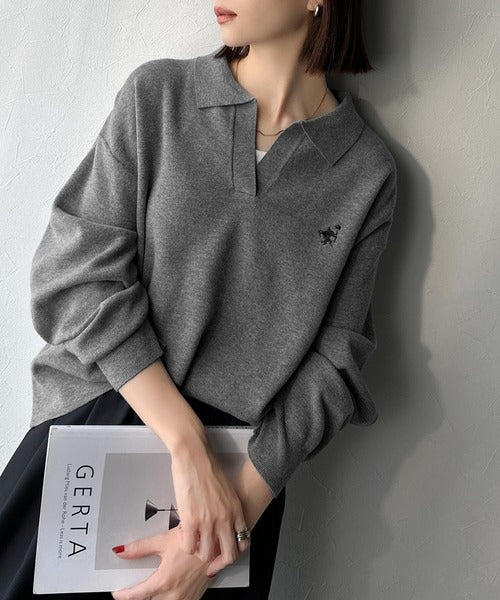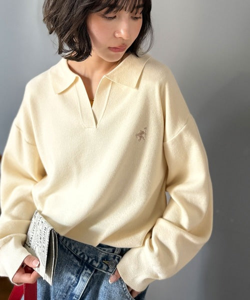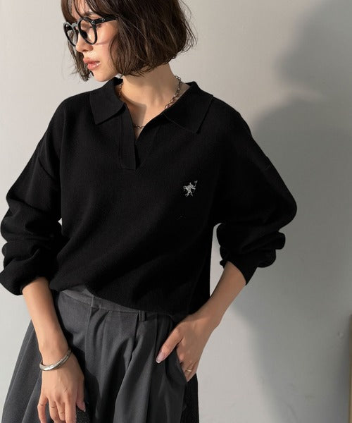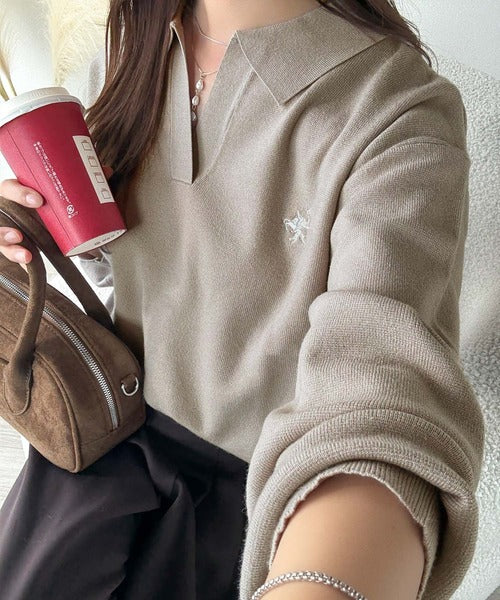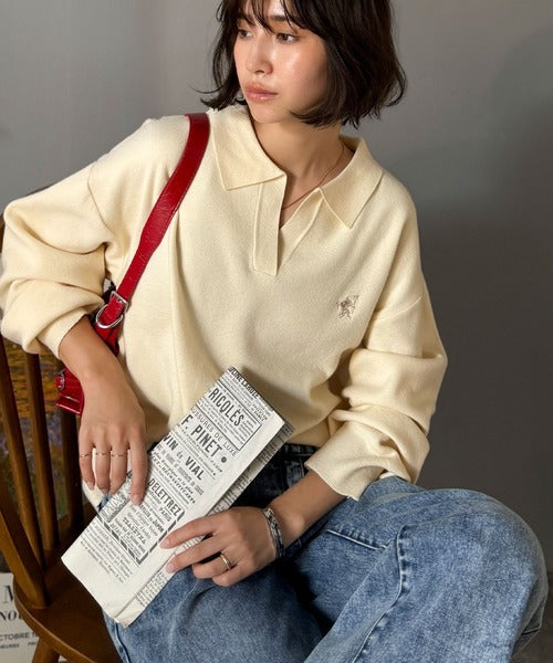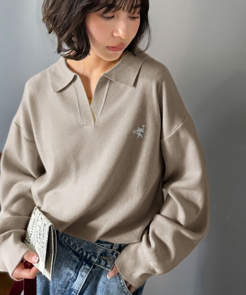 《JaVaジャバコラボ》大人の抜け感をプラス◎胸刺繍ハーフミラノスキッパーニット jv1260490