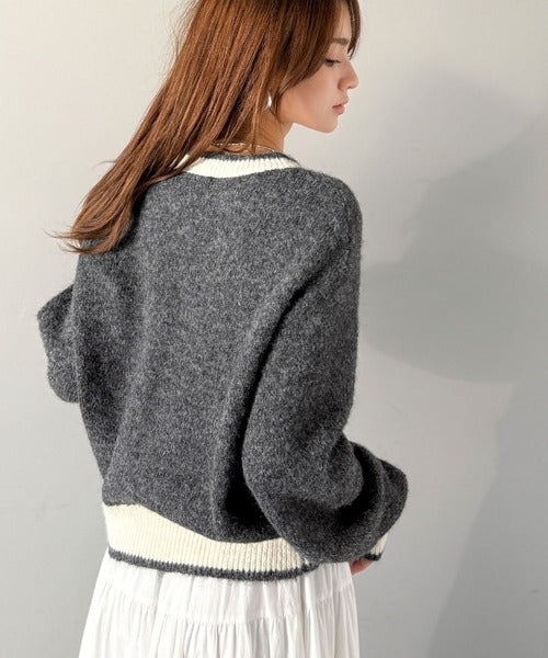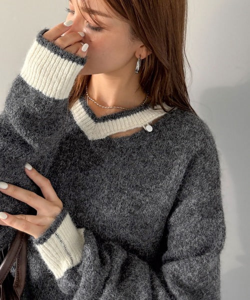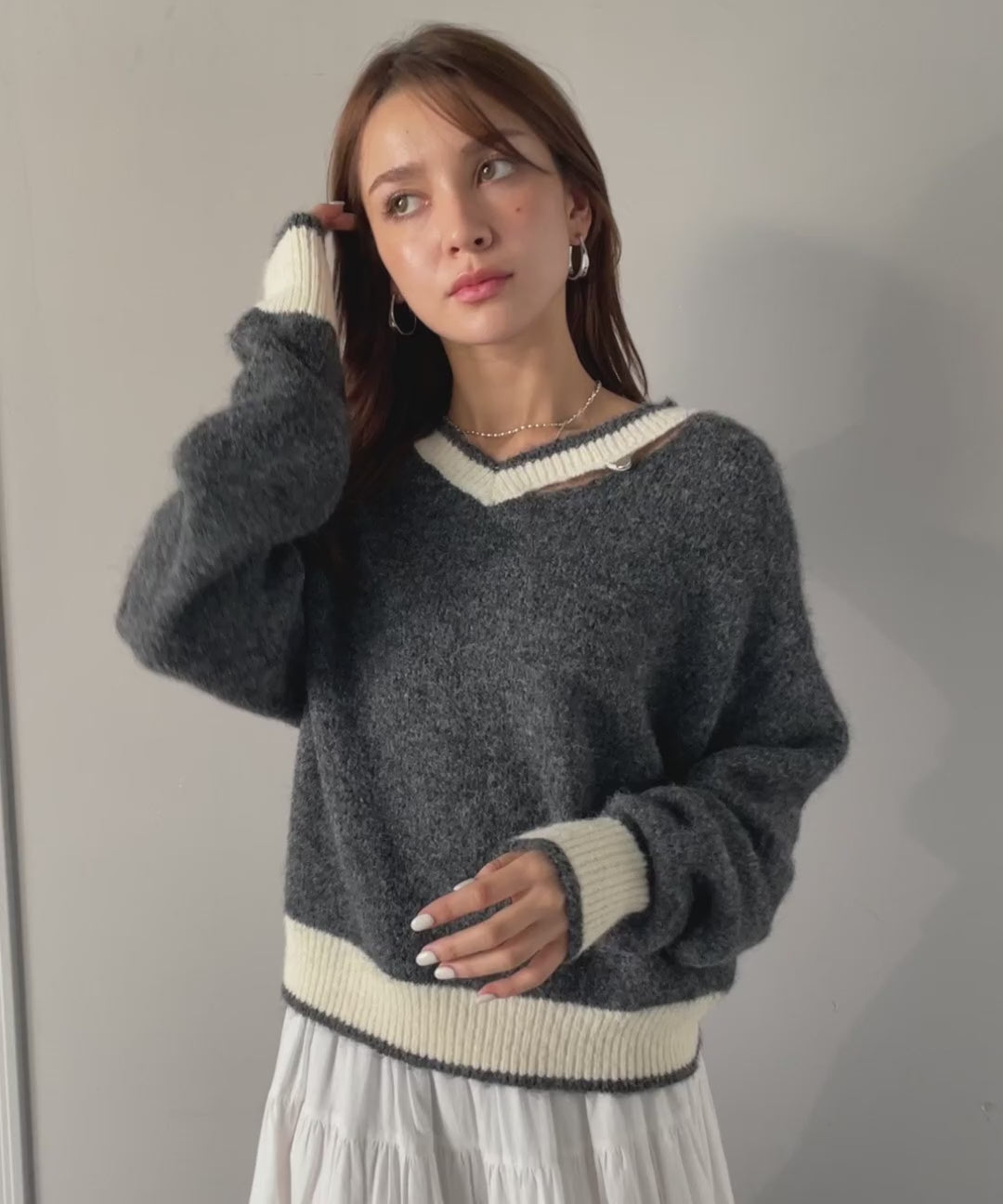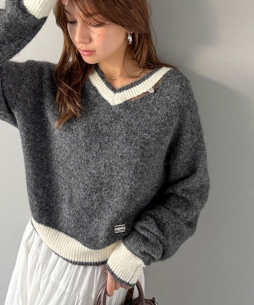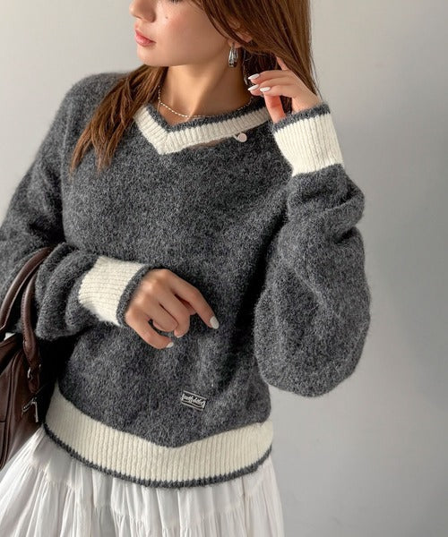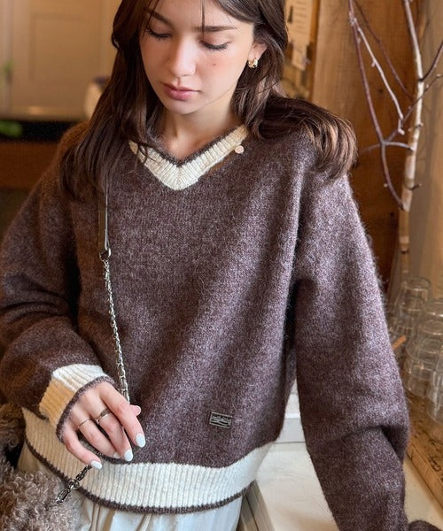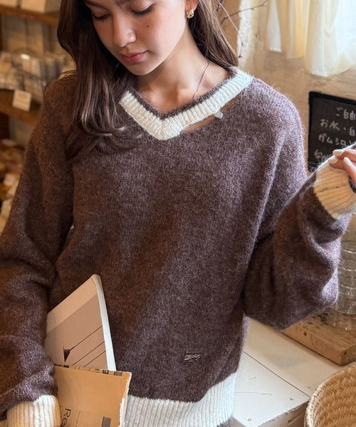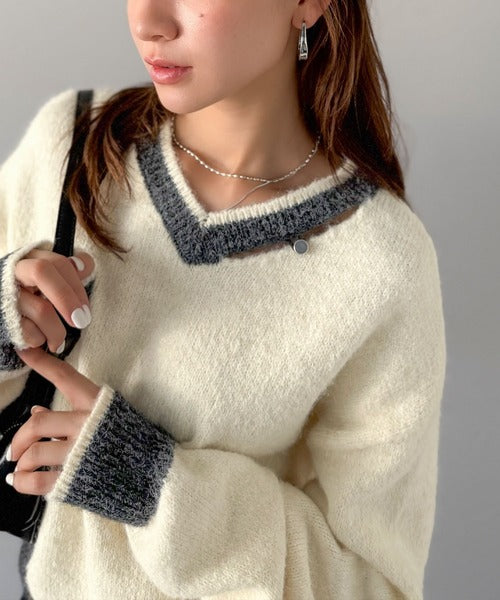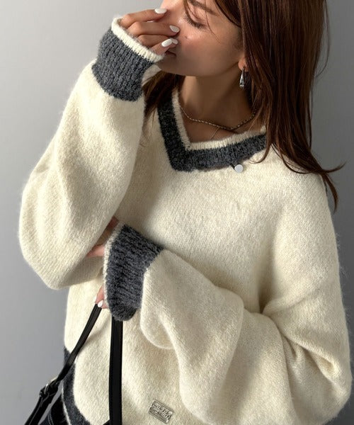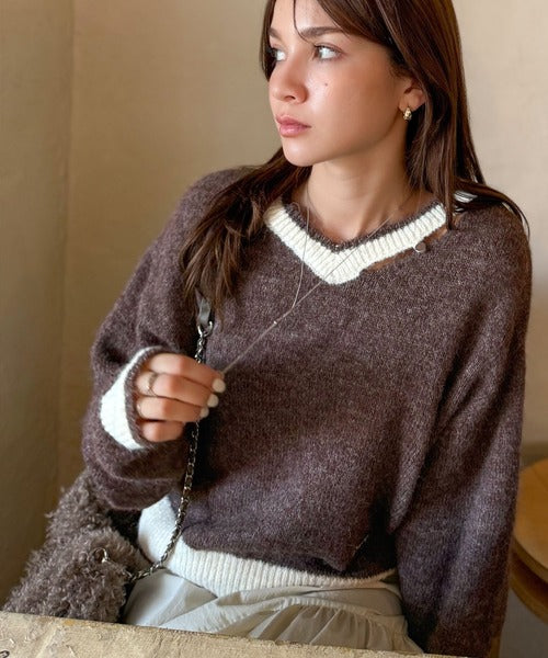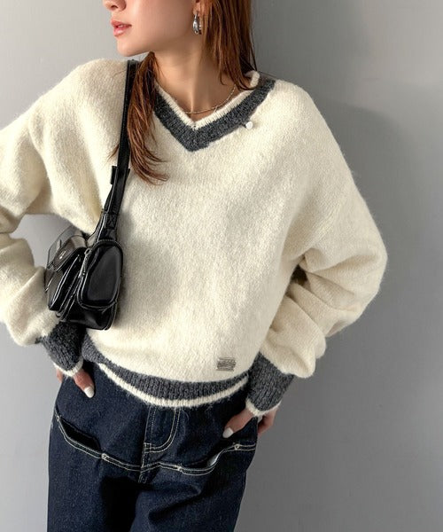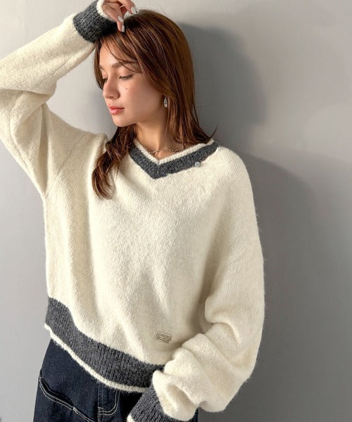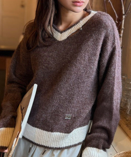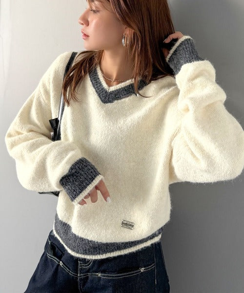 ふんわりとした起毛感が特徴の配色Vネックニットプルオーバー。