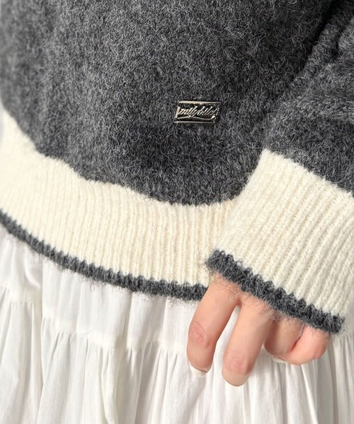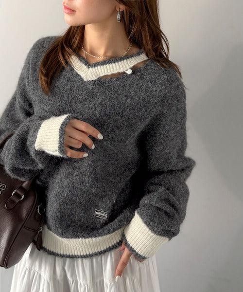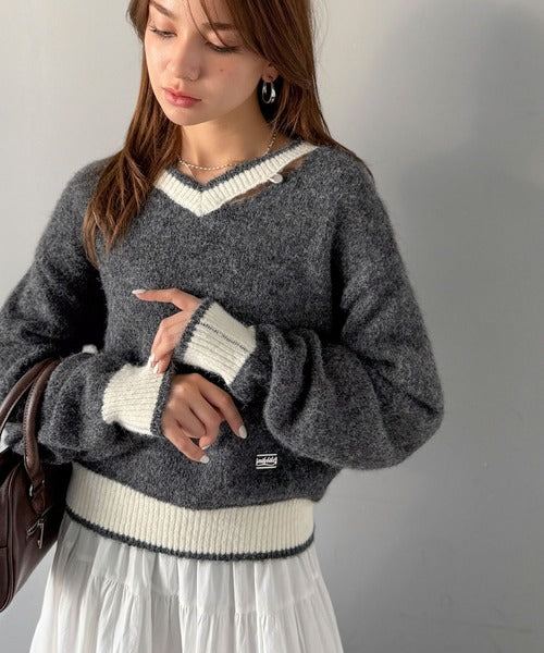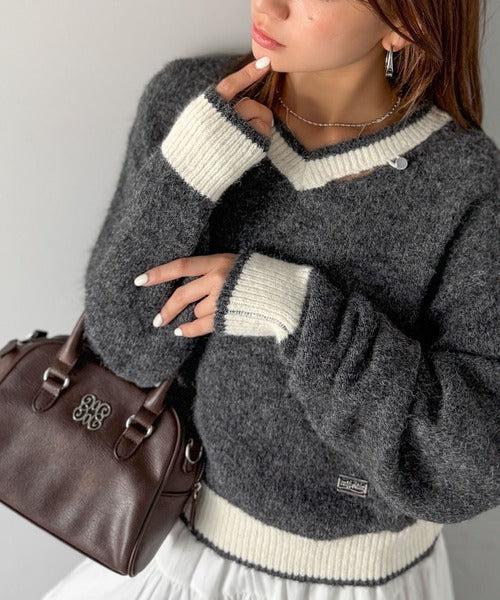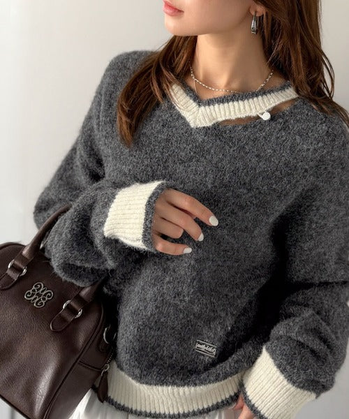 【mily bilet】上品に、可愛く。大人の抜け感を演出する。スリット見せロゴプレート使い配色Vネックニットプルオーバー(長袖) mi1029156