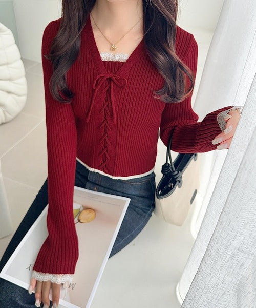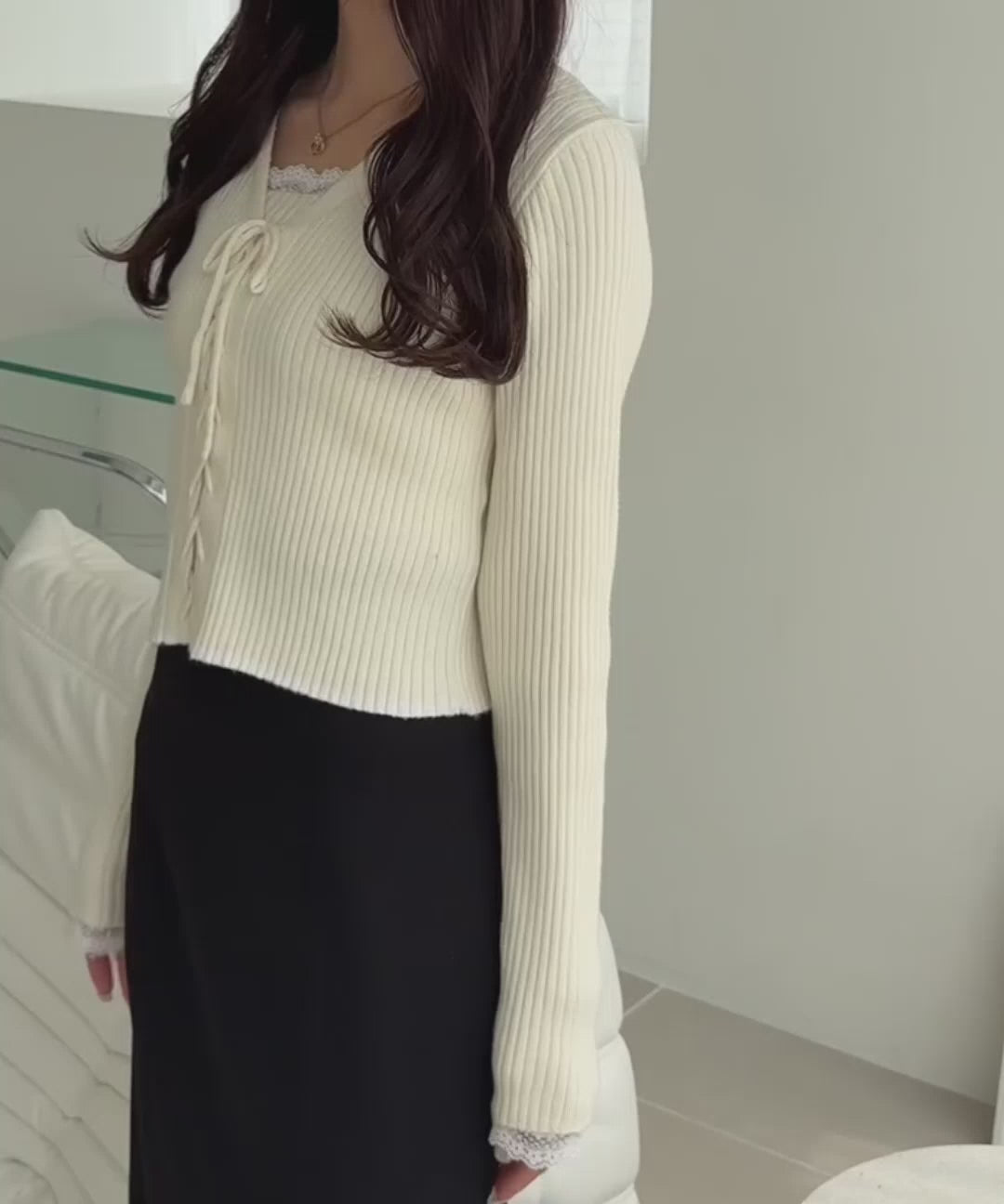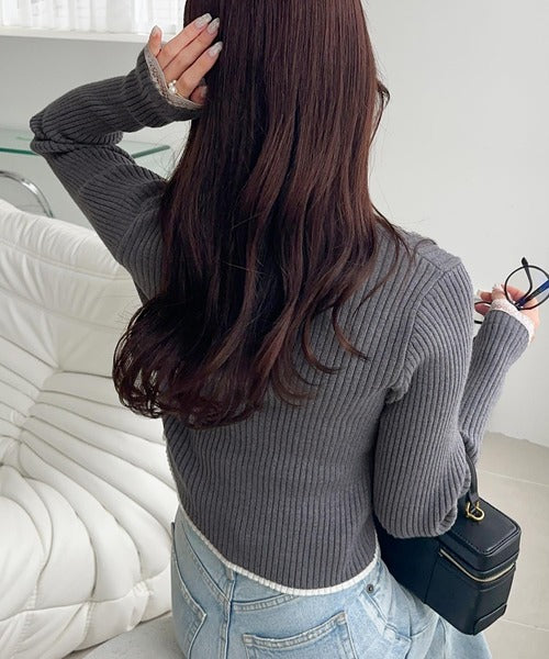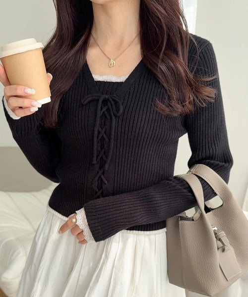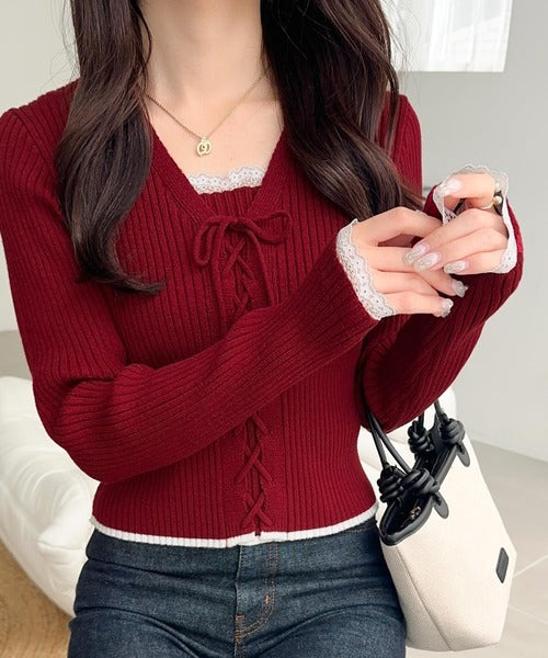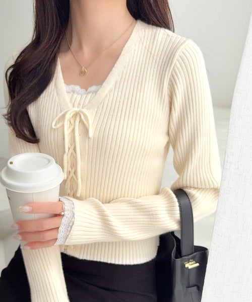 チラッと見えるレースが女性らしいデザインのリブニット♪